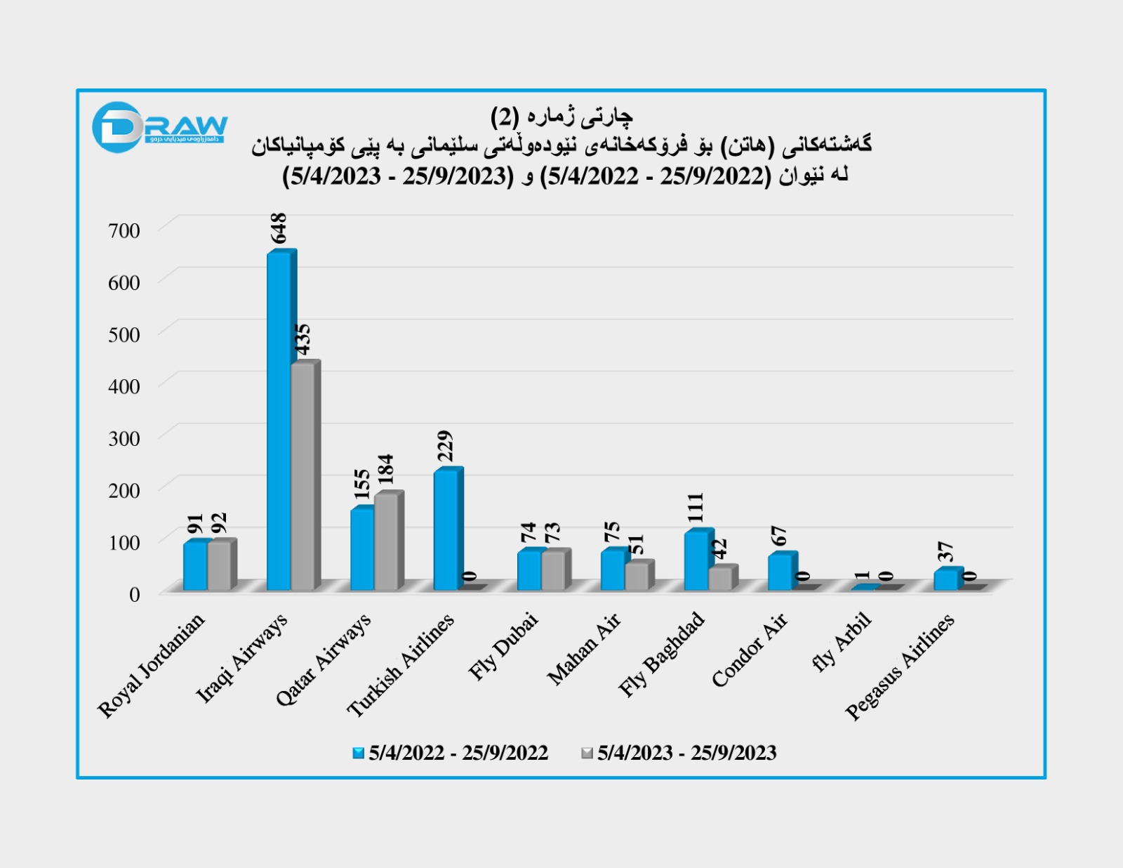 بەپێی ئەو داتایانەی لە بەشەکانی (یەکەم و دووەم) رونمان کردەوە، لەگەڵ دەستپێکردنی گەمارۆکانی تورکیا لە (5/4/2023 – 25/9/2023)، (877) گەشتی هاتن و (870) گەشتی رۆشتن لە لەلایەن (6) کۆمپانیای فرۆکەوانییەوە ئەنجامدراوە.