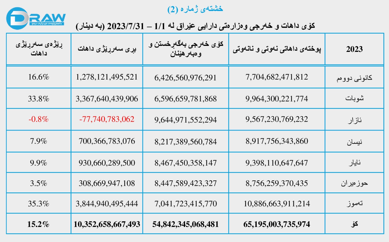 بۆ وردەکاری تەواوی (داهات، خەرجی گشتی و سەرڕێژی داهات) لە (1/1/2023 – 31/7/2023) بڕوانە (خشتەی ژمارە (2)).