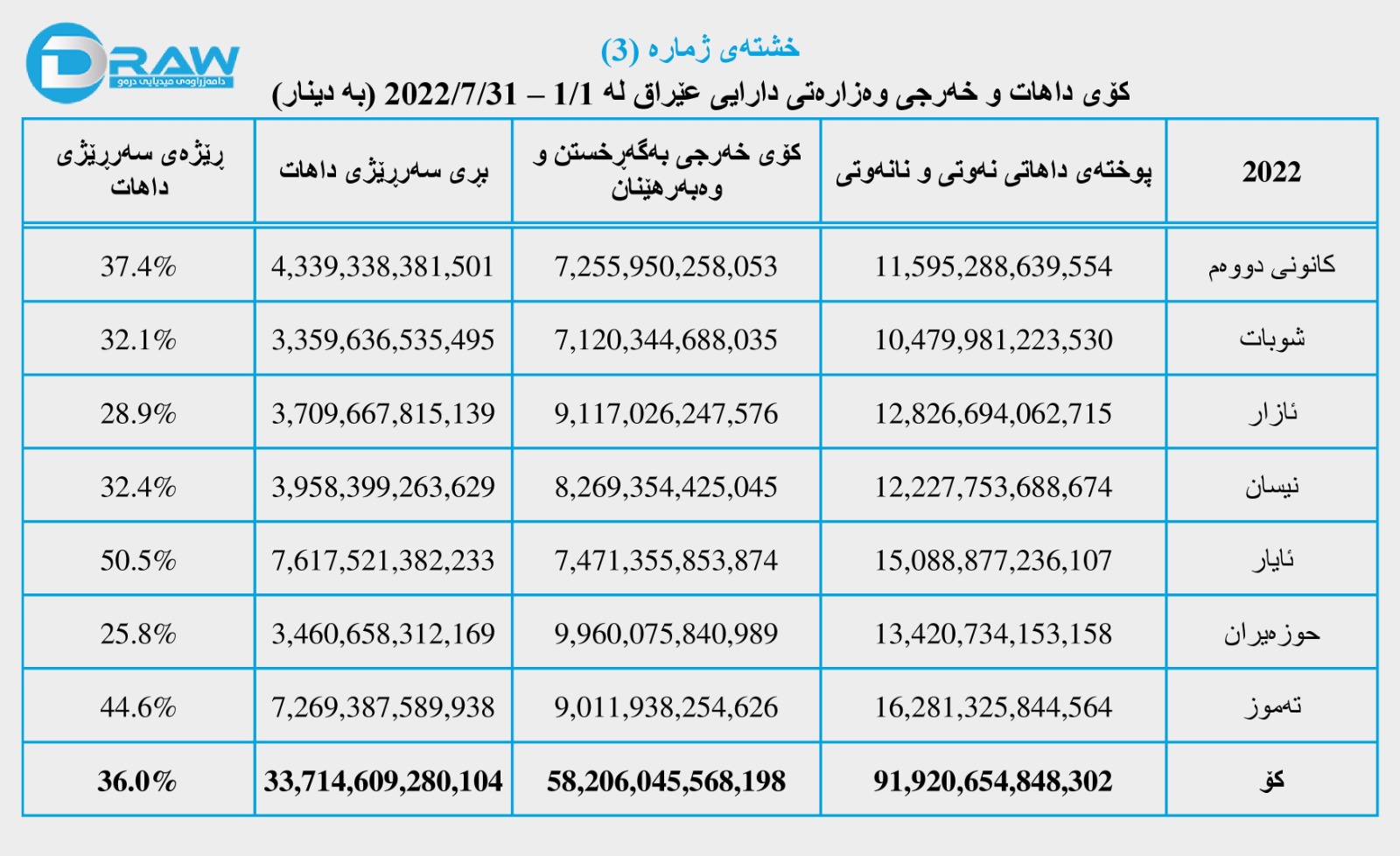 پاڵپشت بە ڕاپۆرتەکانی وەزارەتی دارایی عێراق، لە سەرەتای ساڵ تا کۆتایی تەموزی ساڵی (2022).