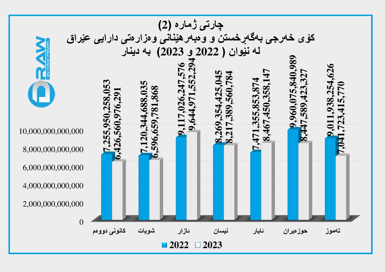 کۆی خەرجی گشتی (بەگەڕخستن و وەبەرهێنان) لە (1/1/2023 – 31/7/2023) بریتی بووە لە (54 ترلیۆن و 842 ملیار و 345 ملیۆن و 68 هەزار و 481) دینار. بەڵام لە هەمان ماوەی ساڵی (2022)، خەرجی گشتی وەزارەتەکە بریتی بووە لە (58 ترلیۆن و 206 ملیار و 45 ملیۆن 568 هەزار و 198) دینار. واتە خەرجی گشتی بڕی (3 ترلیۆن و 363 ملیار و 700 ملیۆن و 499 هەزار و 717) دینار بە رێژەی (5.8%) بەراورد بە ساڵی پێشتر کەمی کردووە. بۆ بەراوردی سەرجەم مانگەکان بڕوانە (چارتی ژمارە (2))