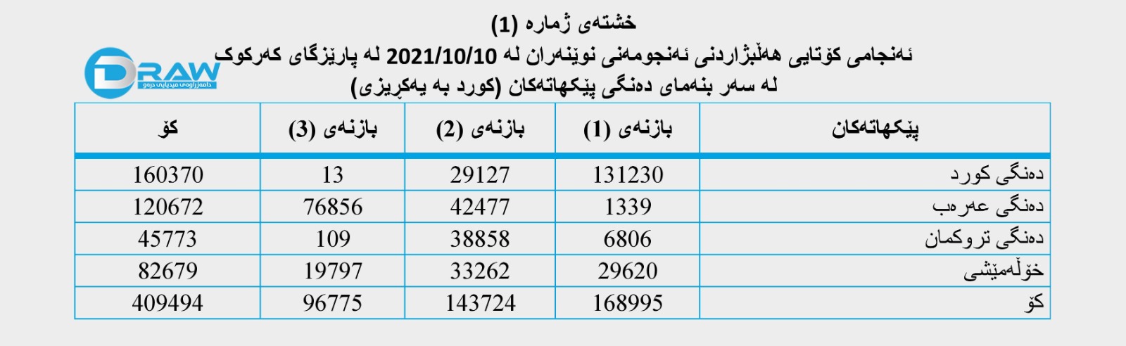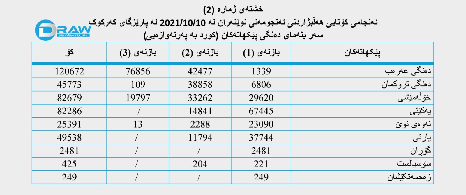 بەپێی دواین ئەنجامی هەڵبژاردنی ئەنجومەنی نوێنەرانی عێراق لە پارێزگای كەركوك كە لە (10/10/2021) بەڕێوەچوو _ كە پارێزگاكە لە سێ بازنەی هەڵبژاردن پێكهاتبوو لە سەر ئاستی هەرسێ بازنەكەی هەڵبژاردن (409 هەزار و 494) دەنگی ڕاستەقینە بەدەستهاتووە، بەجۆرێك؛
