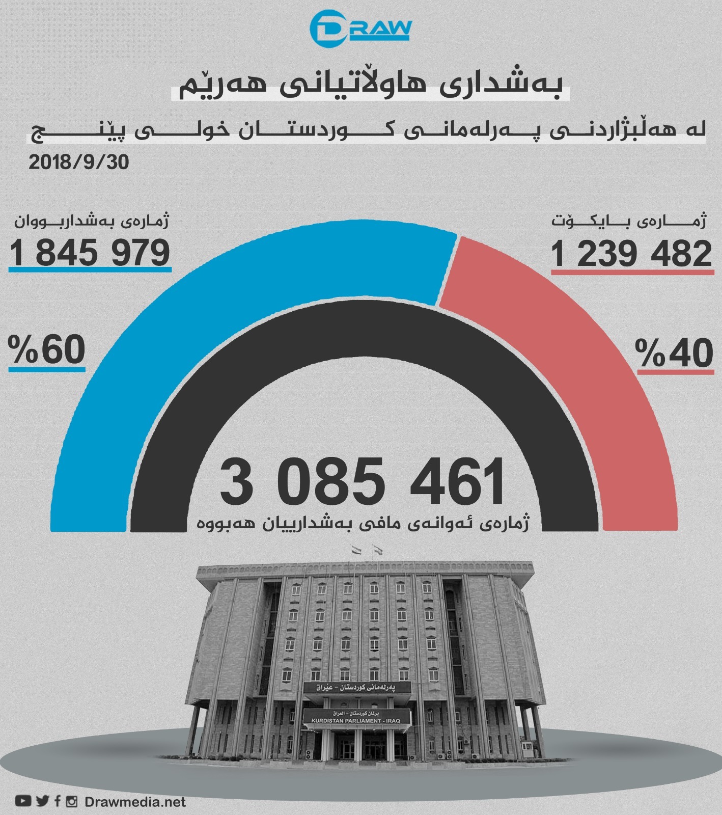 بەڵام لە پێنجەم خولی هەڵبژاردنی پەرلەمانی کوردستان، کە لە (30/9/2018) بەڕێوەچوو لە کۆی (3 ملیۆن و 85 هەزار و 461) کەس کە مافی دەنگدانیان هەبوو (40%)یان بایکۆتی پرۆسەکەیان کرد و تەنها (ملیۆنێک و 845 هەزار و 979) کەس بە رێژەی (60%) بەشداری پرۆسەکەیان کرد. (بڕوانە گرافیکی ژمارە (1)) تایبەت بە بەشداری هاوڵاتیانی هەرێمی کوردستان لە هەڵبژاردنی پەرلەمانی کوردستان خولی پێنجەمی (30/9/2018).