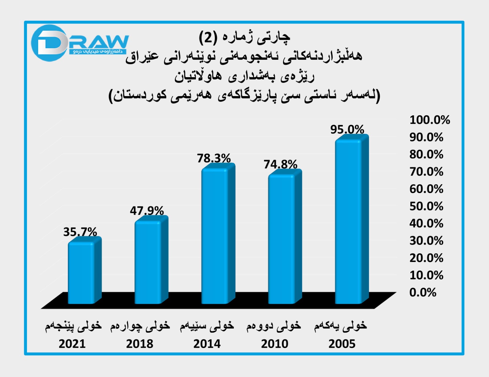 ? لە خولی یەکەمی هەڵبژاردنی ئەنجومەنی نوێنەرانی عێراق "لەسەر ئاستی سێ پارێزگاکەی هەرێم" لە (30/1/2005)ەوە بۆ دواین خول کە لە (10/10/2021) بەڕێوەچوو، ڕێژەی بەشداری لە (95%)ەوە بۆ (36%) دابەزیوە، ڕێژەی بایکۆتی هەڵبژاردن لە (5%)ەوە بەرزبووەتەوە بۆ (64%).