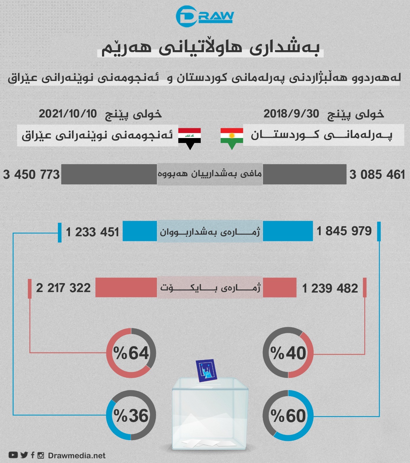 وەک ئەوەی لە تەوەری دووەم و سێیەمدا رونکرایەوە، پێنجەم خولی هەڵبژاردنی پەرلەمانی کوردستان، کە لە (30/9/2018) بەڕێوەچوو لە کۆی (3 ملیۆن و 85 هەزار و 461) کەس کە مافی دەنگدانیان هەبوو (40%)یان بایکۆتی پرۆسەکەیان کرد و تەنها (ملیۆنێک و 845 هەزار و 979) کەس بە رێژەی (60%) بەشداری پرۆسەکەیان کرد.