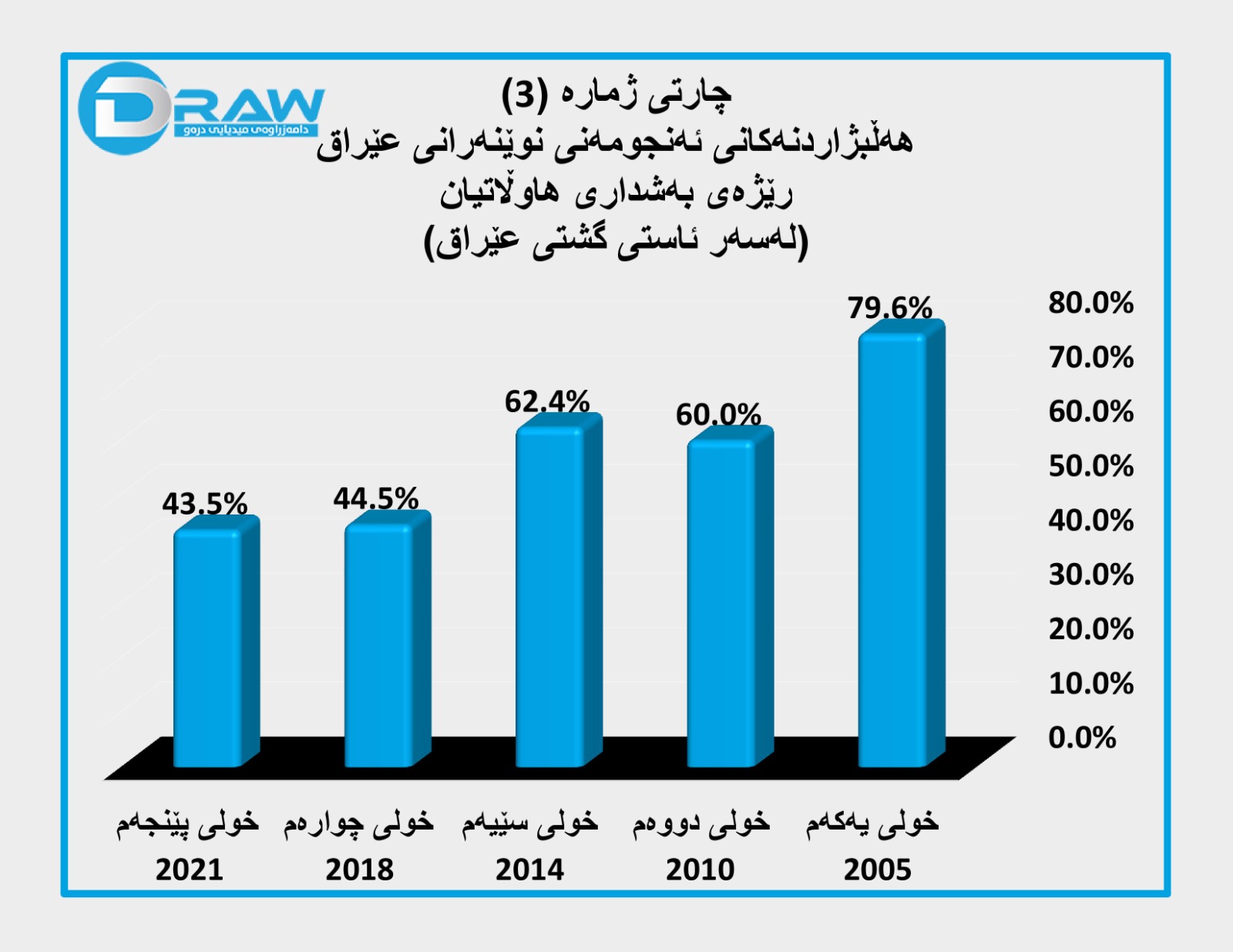 ? لە خولی یەکەمی هەڵبژاردنی ئەنجومەنی نوێنەران"لەسەر ئاستی (18) پارێزگاکەی عێراق" لە ساڵی (30/1/2005)ەوە بۆ دواین خول کە لە (10/10/2021) بەڕێوەچوو، ڕێژەی بەشداری لە (80%)ەوە بۆ (43.5%) دابەزیوە، ڕێژەی بایکۆتی هەڵبژاردن لە (20%)ەوە بەرزبووەتەوە بۆ (56.5%).