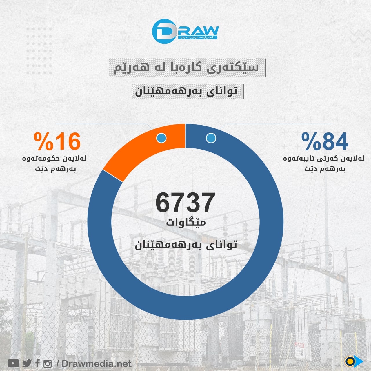 • رێژەی (84%)ی كارەبای هەرێم لەلایەن كەرتی تایبەتەوە بەرهەم دەهێنرێتو رێژەی (16%)ی لەلایەن كەرتی گشتییەوە بەرهەم دێت.