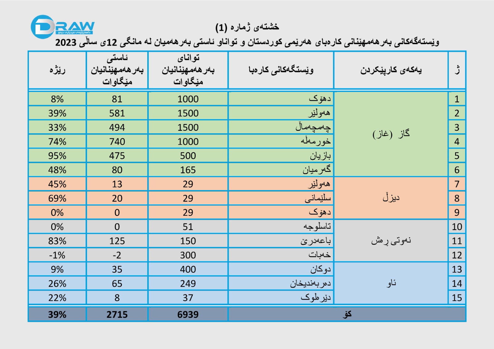 بەڵام بەپێی داتاکانی بەڕێوەبەرایەتی گشتی دابەشکردنی کارەبای هەرێم لە مانگی (12)ی ساڵی (2023)، سەرجەم ئەو وێستگانە (2 هەزار و 715) مێگاوات کارەبایان بەرهەمهێناوە بە توانای (39%)ی خۆیان، بەرهەمەکانیشیان بەم شێوەیە بووە؛