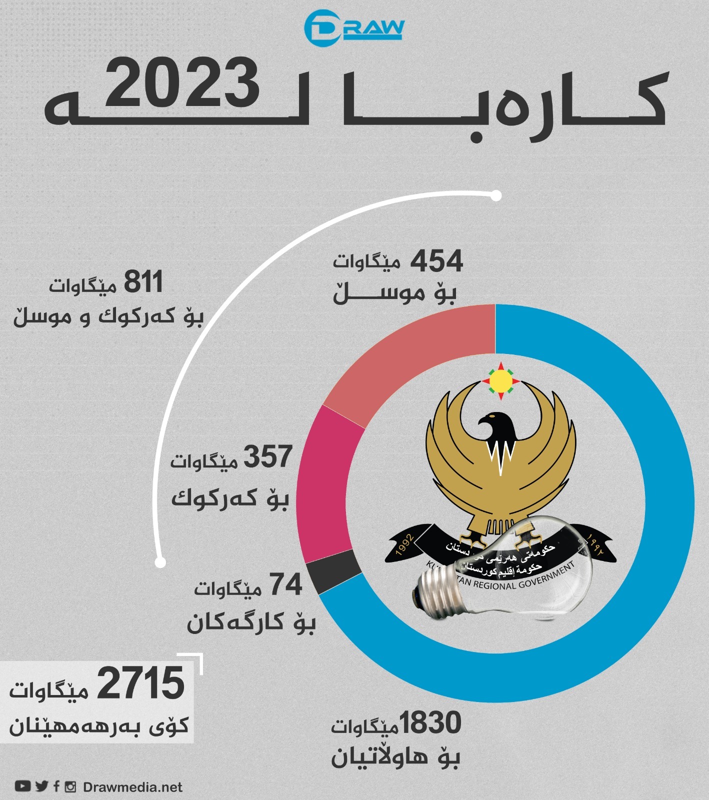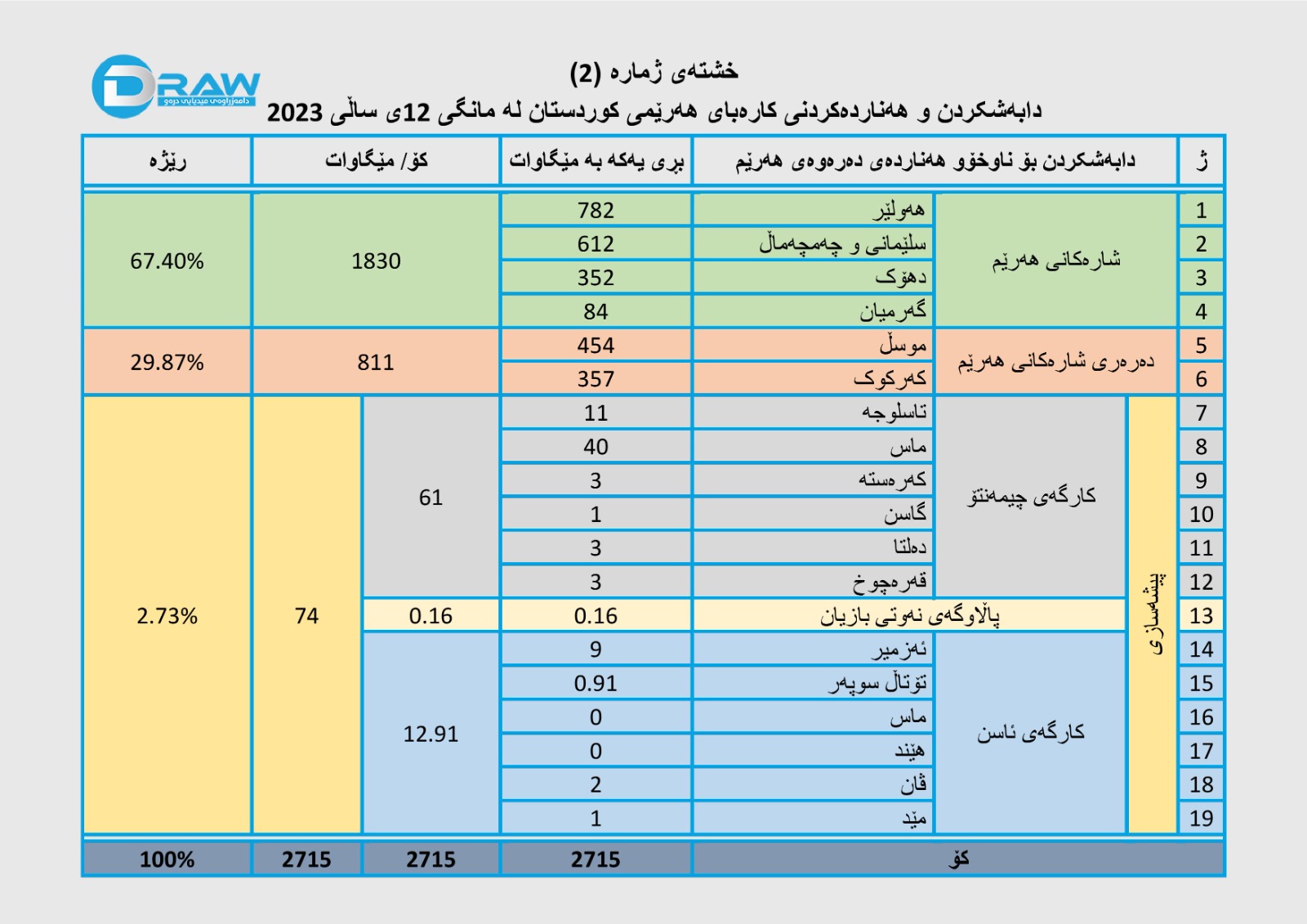 بەپێی داتاکانی بەڕێوەبەرایەتی گشتی دابەشکردنی کارەبای هەرێم لە مانگی (12)ی ساڵی (2023)، لە سەرجەم وێستگاکەکانی کارەبای هەرێم (2 هەزار و 715) مێگاوات کارەبایان بەرهەمهێناوە؛ بەم شێوەیە دابەشکراوەتەوە بەسەر پارێزگاکانی هەرێم و کەرتی پشەسازی و هەناردەکردنی بۆ شارەکانی (کەرکوک و موسڵ) بەم شێوەیەی لای خوارە؛