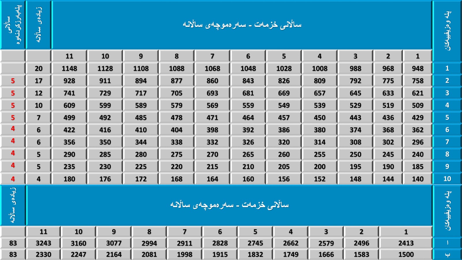 (مادەی سێیەم) بڕگەی یەکەم: پلەکانی فەرمانبەران و سەرمووچەی ساڵانەیان و ماوەی پلە بەرز کردنەوەیان بەم شێوەیە دەبێت کە لە خشتەی مووچەکان و سەرمووچەی ساڵانە هاتووە (بڕوانە خشتەی ژمارە (1))