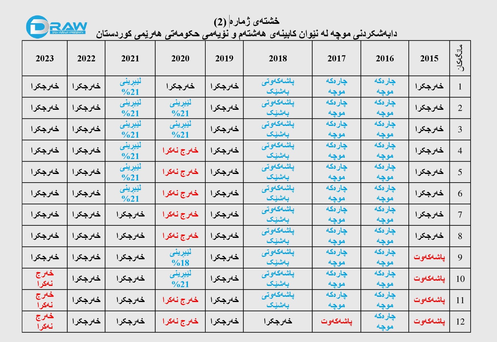 بڕوانە خشتەکانی خوارە تایبەت بە شێوازی خەرجکردنی موچە و بڕو قەبارەی قەرزی کەڵەکەبوی موچەخۆران لە سەر حکومەت.