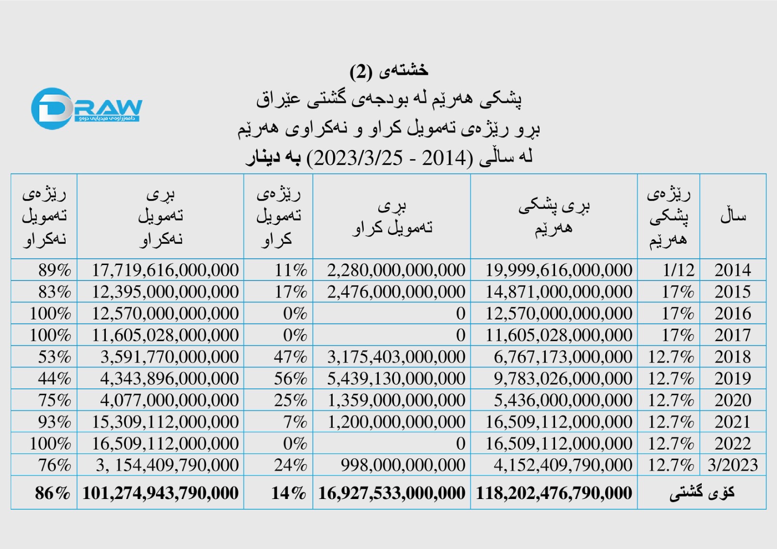 ? نزیکەی (17 ترلیۆن) دیناری بە رێژەی (14%) حکومەتی هەرێم تەمویل کراوە.