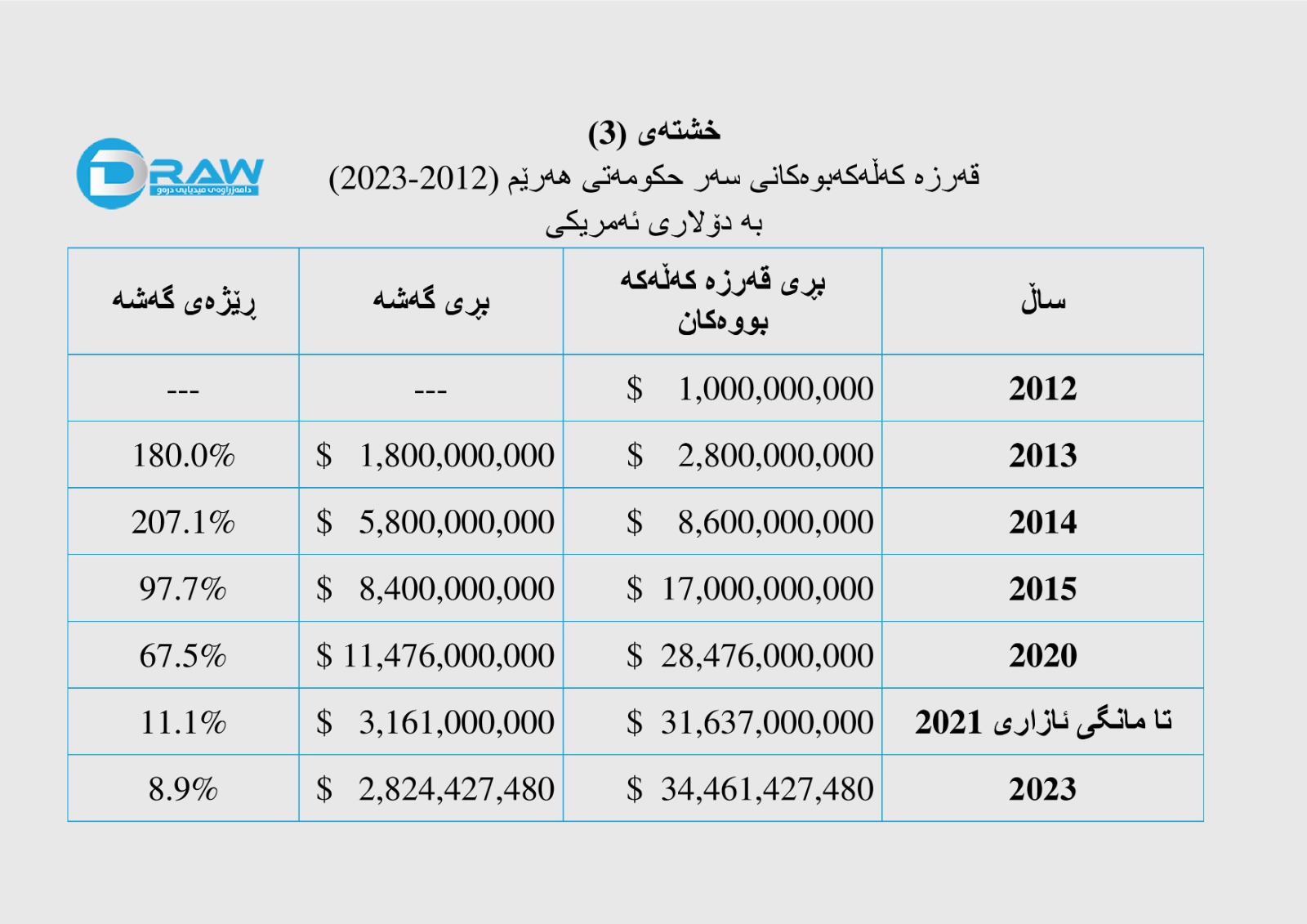 لەماوەی ساڵی (2012) بۆ کۆتایی ساڵی (2023) قەرزە کەڵەکە بووەکانی سەر حکومەتی هەرێم گەیشتووە بە نزیکەی (34 ملیار و 500 ملیۆن) دۆلاری ئەمریکی، کە نزیکەی (28 ملیار) دۆلاری لە سەردەمی ئابوری سەربەخۆو کاتی هەناردەکردنی نەوتی هەرێم کەڵەکە بوونە، بریتین لە قەرزی (موچەی موچەخۆران، پابەندییە داراییەکانی، قەرزی دەرەکی، قەرزی بانکی تی بی ئای و قەرزی ناوخۆیی)، لە ساڵی (2023)دا حکومەتی عێراق بڕی (3 ترلیۆن و 700 ملیار) دیناری بە شێوەی قەرز حکومەتی هەرێمی کوردستانی بە گوژمەی جیاوا تەمویل کردووە، کە بڕەکەی هاوتایە بە (2 ملیار و 824 ملیۆن و 427 هەزار دینار) وەک لە چارتی ژمارە (2)دا هاتووە، شێوازی گەشەکردنەکەشی بەو جۆرە بووە کە لە خشتەی ژمارە (3)دا رونکراوەتەوە.