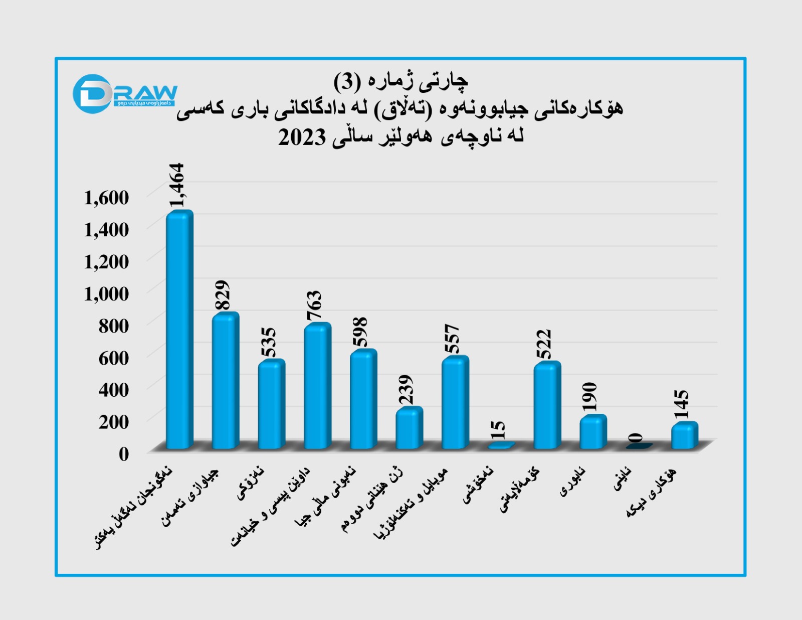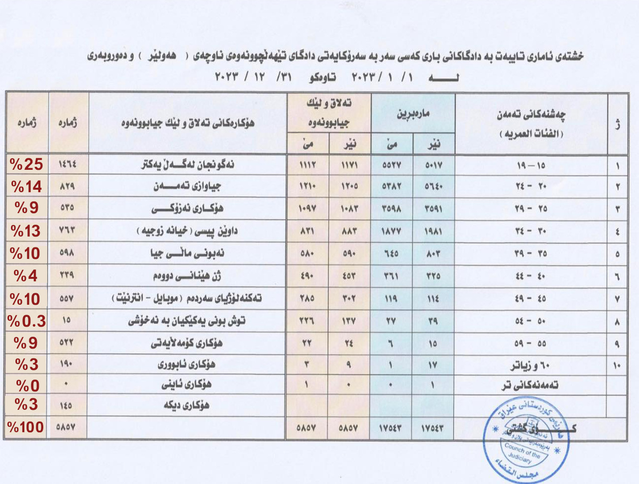 ئەنجومەنی دادوەری هەرێمی کوردستان رۆژی (4/3/2024) داتاو ئامارو دادبینییە تۆمارکراوەکانی خۆی لە ماوەی (1/1/2023 – 31/12/2023) لە سەر ئاستی پارێزگاکانی هەرێمی کوردستان و ئیدارەی گەرمیان، بڵاوکردەوە، بەپێی ئامارەکان؛