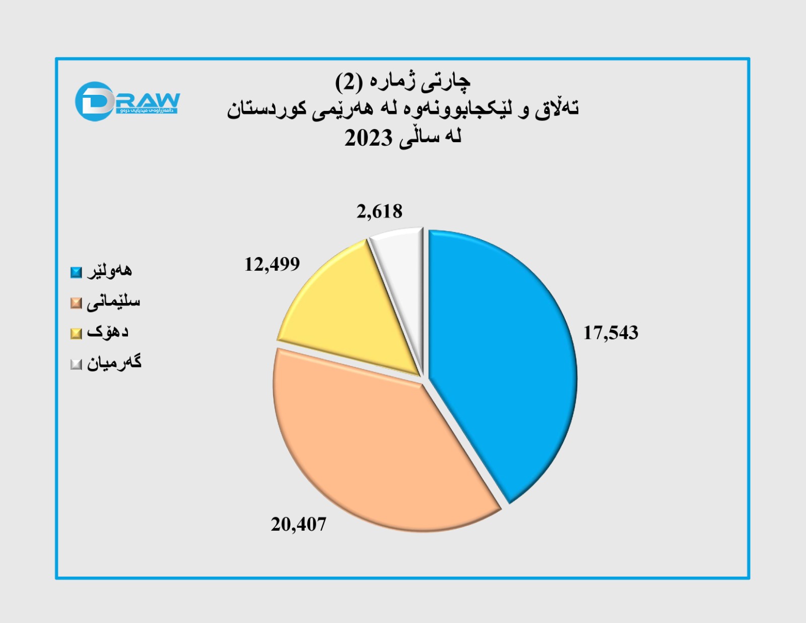 لەسەر ئاستی هەرێمی کوردستان (14 هەزار و 312) حاڵەتی جیابوونەوە تۆمارکراوە، وەک لە (چارتی ژمارە (2)) دا هاتووە بەرزترین رێژەی جیابوونەوە لە پارێزگای هەولێر بووە، بە جۆرێک؛