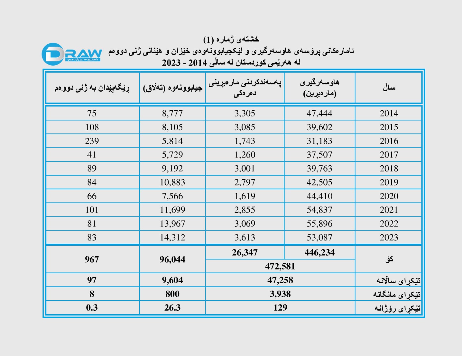 ? لەماوەی سالانی (2014 - 2023) لە دادگاکانی هەرێمی کوردستان (472 هەزار و 581) پرۆسەی هاوسەرگیری تۆمارکراوە کە (446 هەزار و 234) حاڵەتیان ڕاستەوخۆ لە دادگاکان تۆمار کراون (26 هەزار و 347) حاڵەتیان مارەبڕینی دەرەکی بوونەو لە دادگا پەسەندکراون. واتە بە تێکڕا؛ ساڵانە (47 هەزار و 258) حاڵەت، مانگانە (3 هەزار و 938) حاڵەت و رۆژانە (129) مارەبڕین تۆمارکراون.