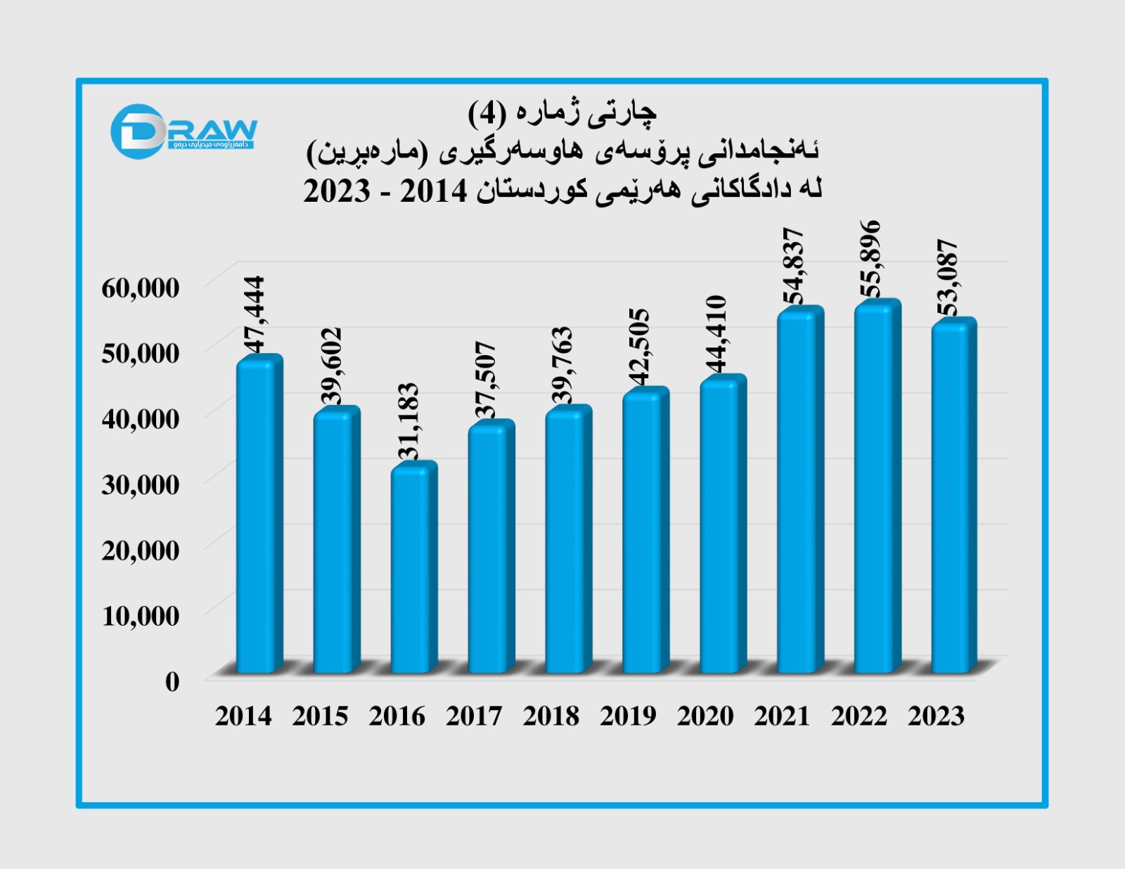 پاڵپشت بە داتاو ئامارەکانی ئەنجومەنی دادوەری هەرێمی کوردستان لە ماوەی (10) ساڵی ڕابردوودا سەرجەم ئەو گرێبەستانەی بەمەبەستی هاوسەرگیری لە دادگاکانی هەرێمی کوردستان بە فەرمی تۆمار کراون ژمارەیان (446 هەزار و 234) گرێبەست بوونەوە بەزترین ئاستی ژمارە مارەبڕین لە ساڵی (2022) تۆمار کراوە کە بریتی بووە لە (55 هەزارو 896) حاڵەت، کەمترین مارەبڕینیش لە ساڵی (2016) تۆمار کراوە کە ژمارەکەی بریتی بووە لە (31 هەزار و 183) حاڵەت. (خشتەی ژمارە (1) و چارتی ژمارە (4)).