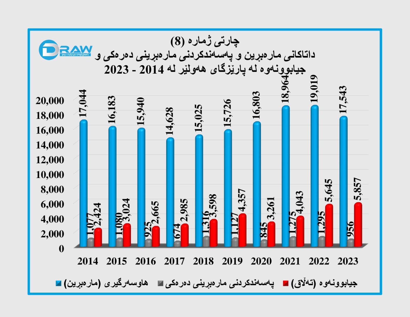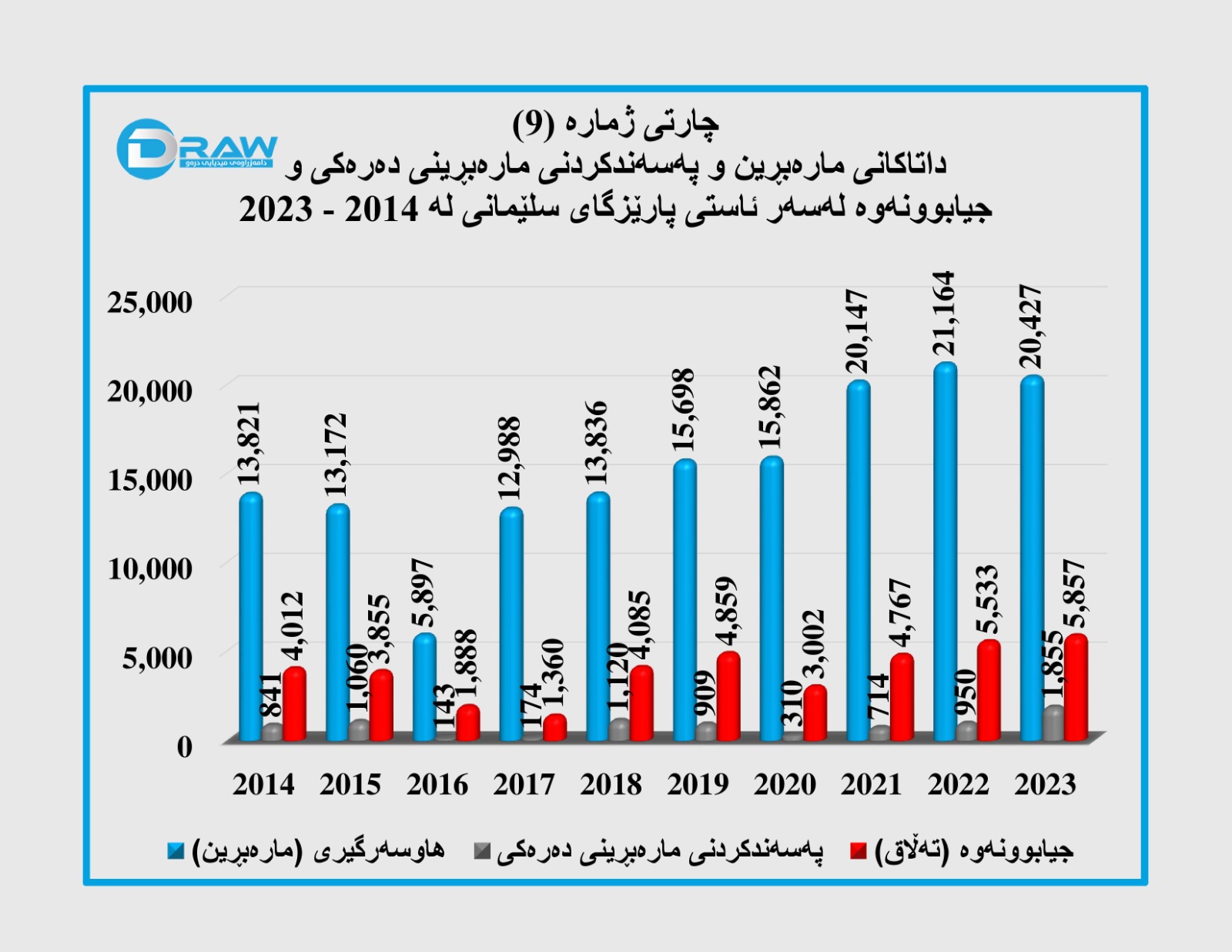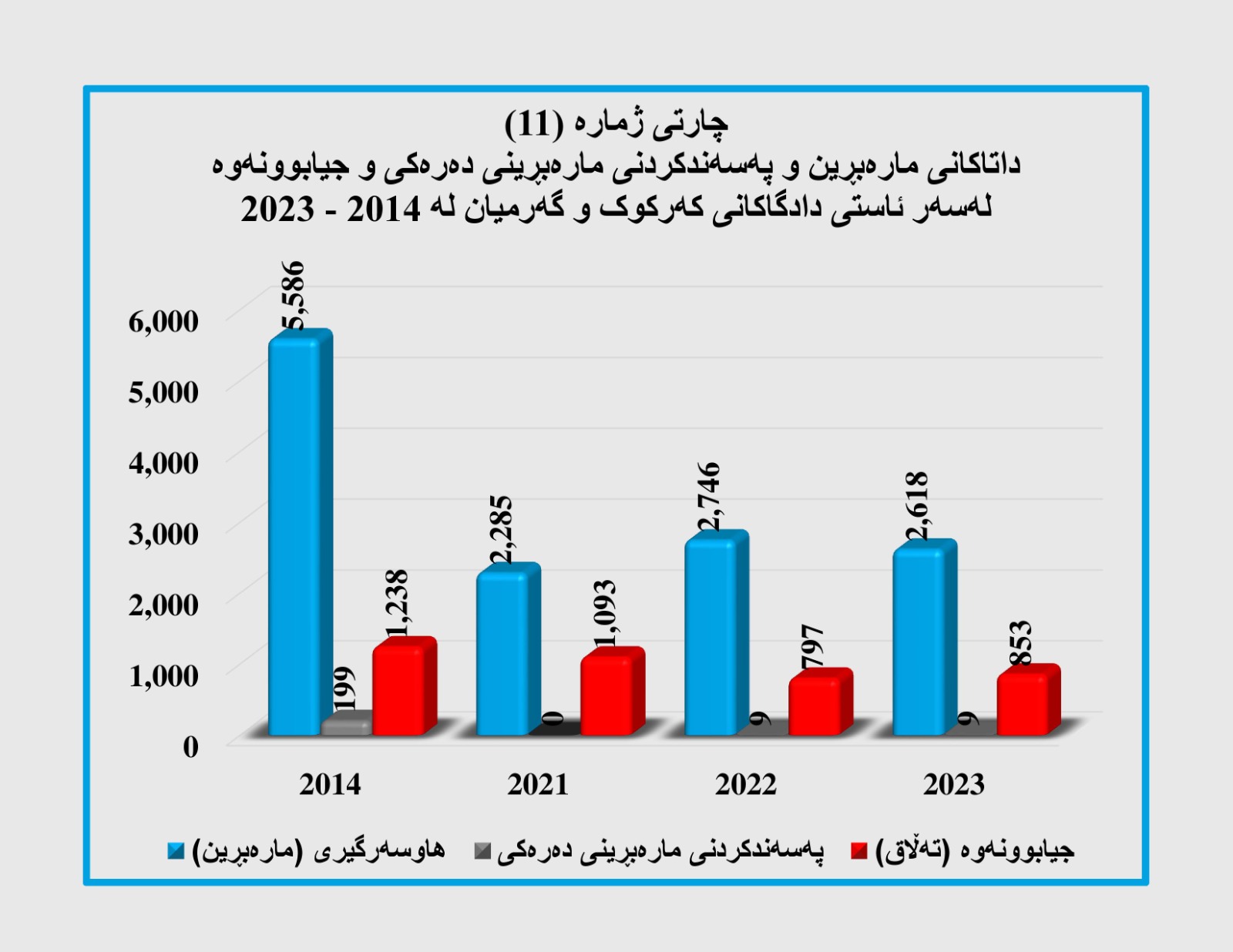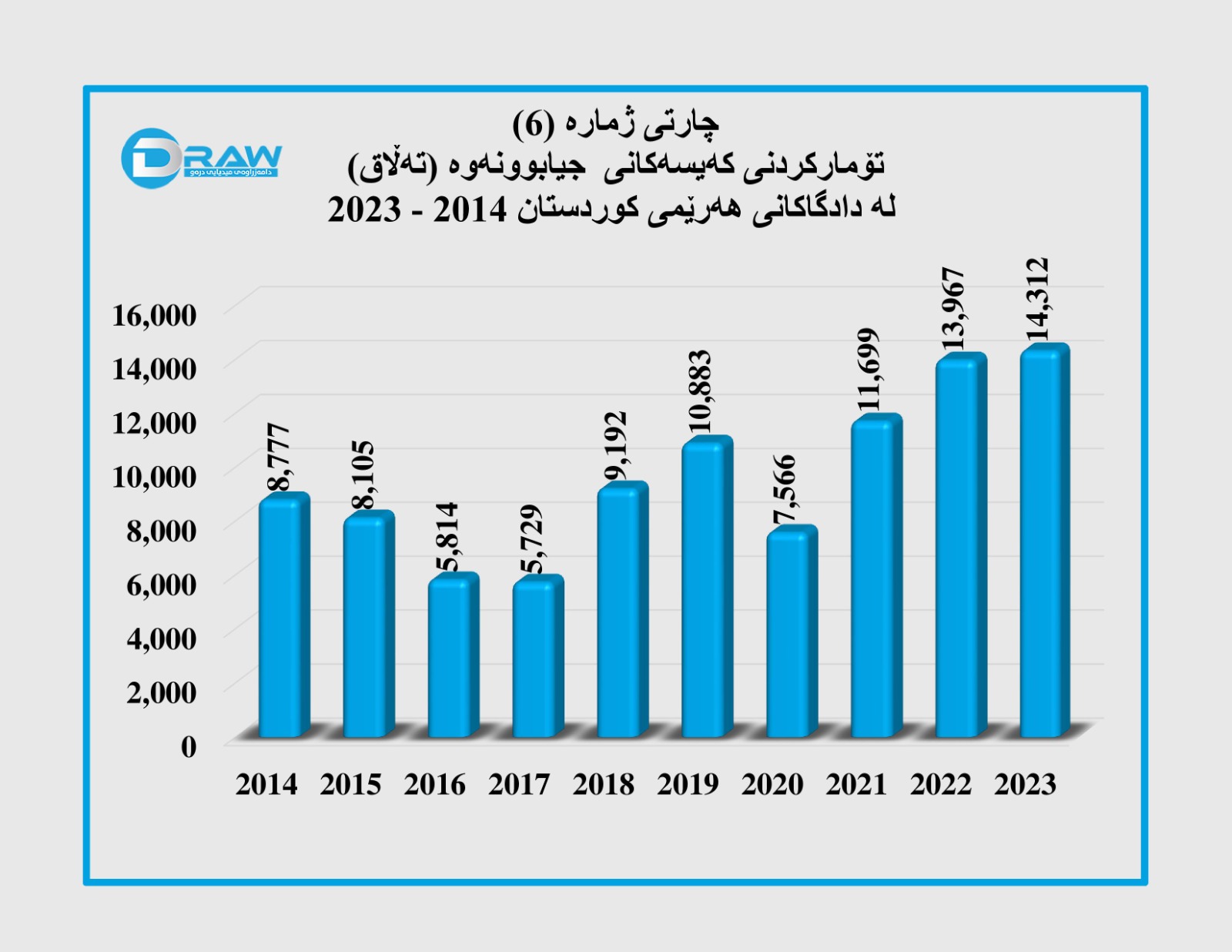 هەر بەپێ ئامارەکان ساڵی (2023) بەرزترین ڕێژەی جیابوونەوەی تێدا تۆمارکراوە کە ژمارەکەی گەیشتووە بە (14 هەزار و 312) حاڵەت. (چارتی ژمارە(6)).