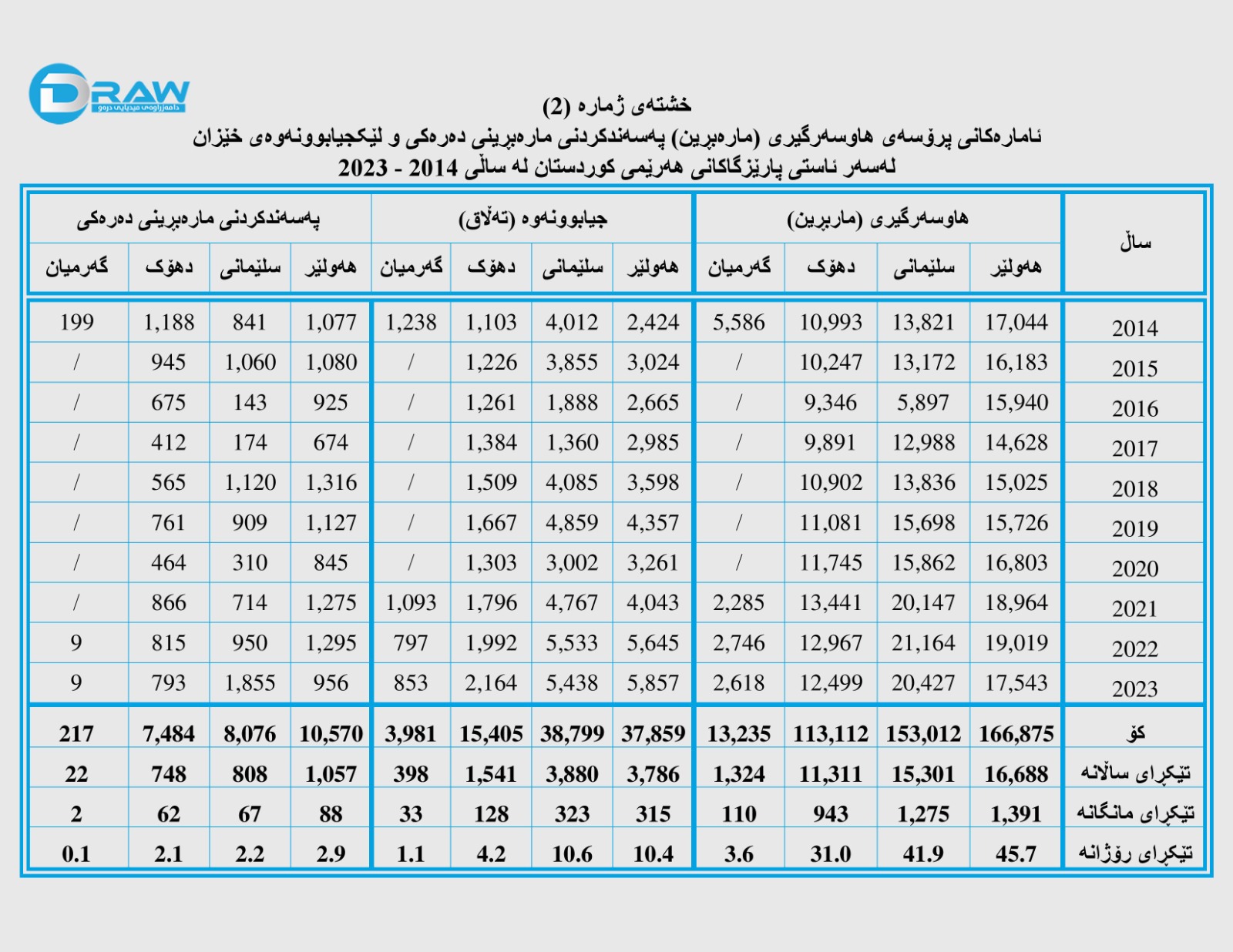 دووەم؛ داتاو ئامارەکانی هاوسەرگیری و هەڵوەشانەوەی خێزان لەسەر ئاستی هەرێمی کوردستان 2014 – 2023