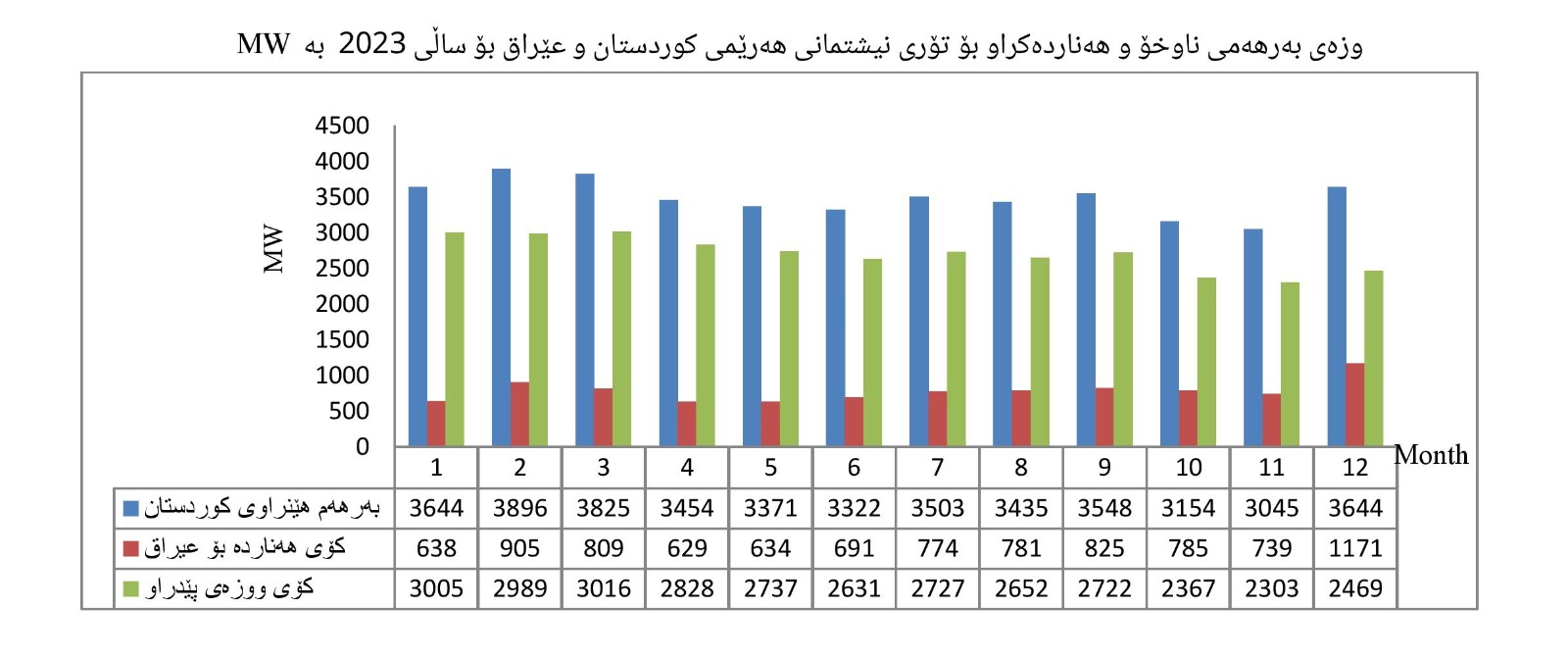 یەکەم؛ وزەی بەرهەمی ناوخۆ و هەناردەکراو بۆ تۆڕی نیشتمانی هەرێمی کوردستان و عێراق بۆ ساڵی 2023 بە مێگاوات