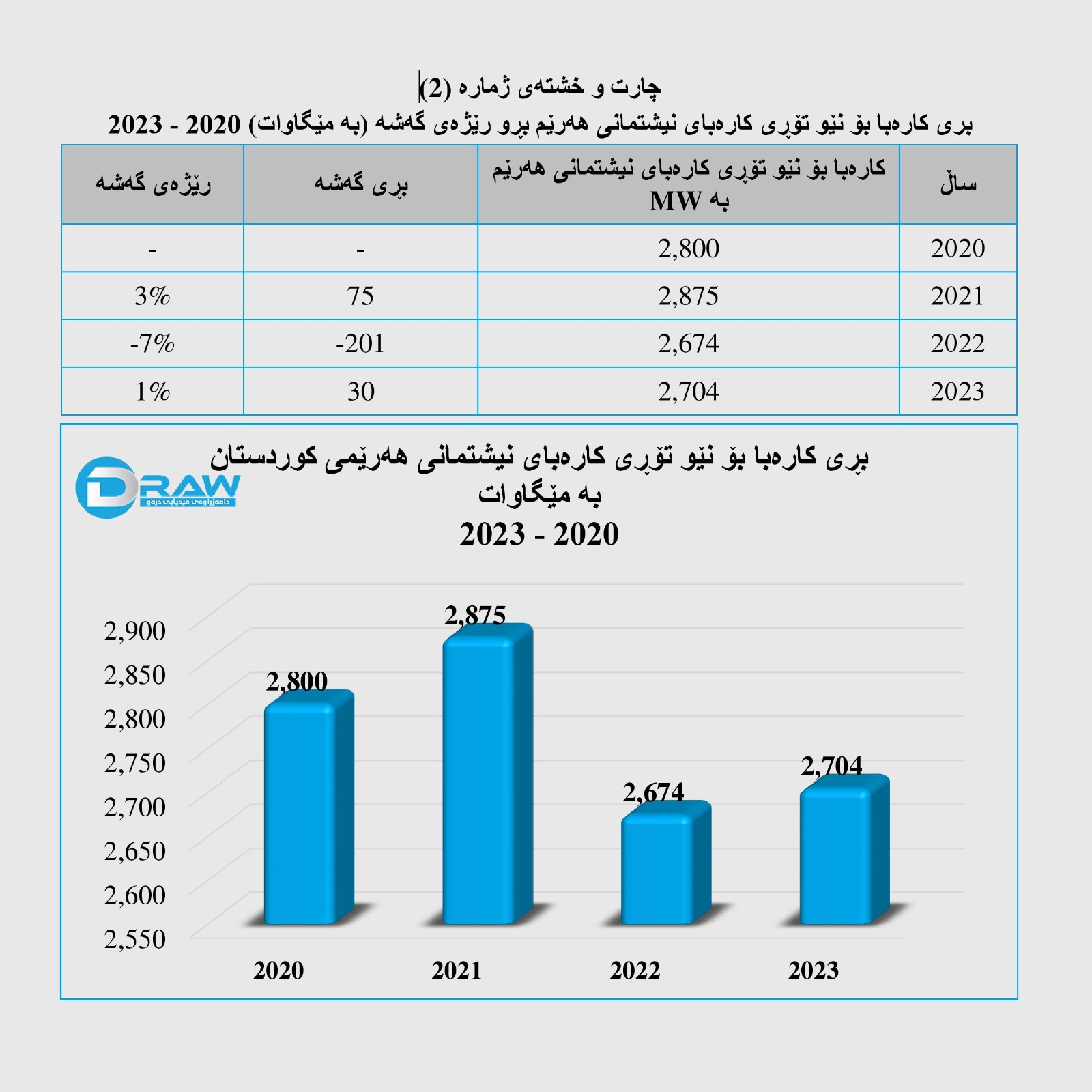 لە ساڵی (2023)دا، بە تێکڕا ئاستی کارەبا بۆ نێو تۆڕی کارەبای هەرێم بریتی بووە لە (2 هەزار و 704) مێگاوات، واتە بەراورد بە ساڵی (2022) تەنها بڕی (30) مێگاوات بە ڕێژەی (1%) زیادی کردووە.