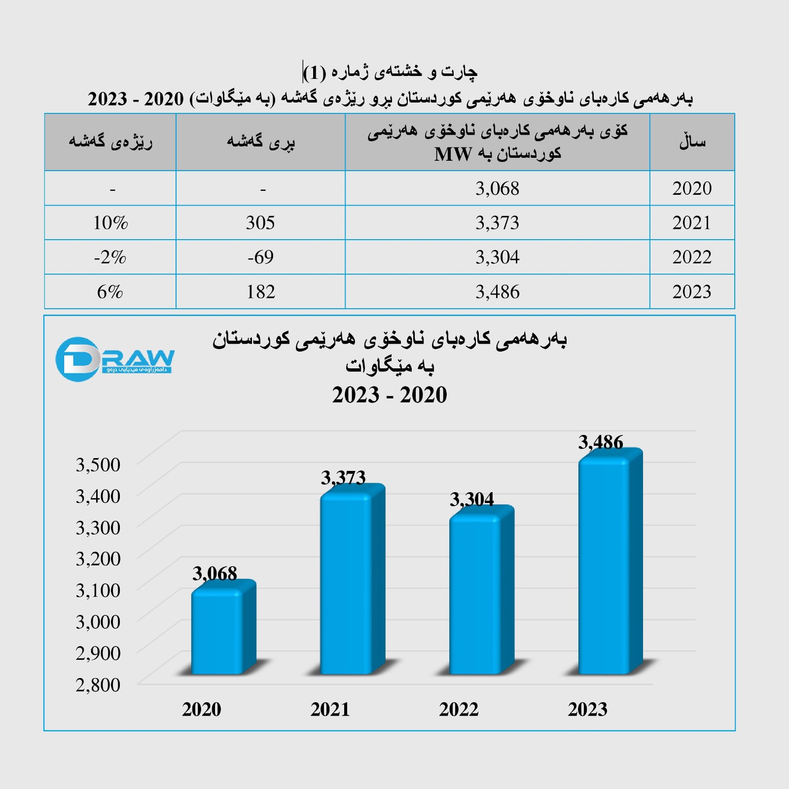 بەپێی داتاو ڕاپۆرتەکانی (بەڕێوەبەرایەتی کۆنترۆڵی ناوەندی وەزاراتی کارەبای حکومەتی هەرێمی کوردستان)، کە فەرمانگەی نابراو ساڵانە ڕاپۆرتی خۆی لەبارەی (وزەی بەرهەمی ناوخۆ و هەناردەکراو بۆ تۆڕی نیشتمانی هەرێمی کوردستان و عێراق بە مێگاوات) بڵاودەکاتەوە، بە گوێرەی ڕاپۆرەتەکانی بەردەست کە بۆ ساڵانی (2020 - 2023) بڵاو کراونەتەوە، ئاستی بەرهەمهێنانی کارەبا گەشەکردنێکی ئەوتۆی بەخۆوە نەبینیوە، بۆ نمونە بە تێکڕا کۆی ئاستی بەرهەمهێنانی کارەبا لە ساڵی (2020) بریتی بووە لە (3 هەزار و 68) مێگاوات، بەڵام لە ساڵی (2021) دا ئاستەکە بەرزبووتەوە بۆ (3 هەزار و 373) مێگاوات، لە ساڵی (2022)دا بە تێکڕا ئاستی بەرهەمی کارەبا دابەزیوەتەوە بۆ (3 هەزار و 304) مێگاوات، لە ساڵی (2023) بە تێکڕا ئاستی بەرهەمی کارەبا گەیشتووە بە (3 هەزار و 486) مێگاوات و بەردەوام هەناردەکردن کارەبا بۆ نێو تۆڕی کارەبای عێراق رووی لە هەڵکشان کردووە.
