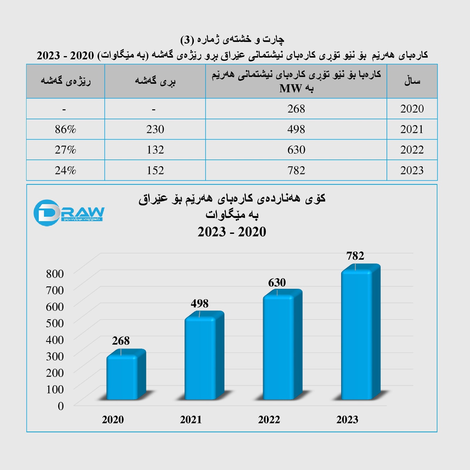 لە ساڵی (2023)دا، بە تێکڕا ئاستی هەناردەی کارەبای هەرێم بۆ نێو تۆڕی کارەبای عێراق گەیشتووە بە )782) مێگاوات، واتە بەراورد بە ساڵی (2022) جارێکی تر بڕی (152) مێگاوات بە ڕێژەی (24%) زیادی کردووە.