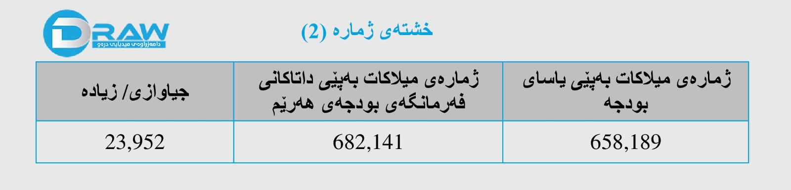 2. ژمارەی میلاکاتی هەرێم هاوتا نیە لە نێوان ئەو داتایانەی فەرمانگەی بودجەی وەزارەتی دارایی و ئابوری هەرێم پێی داون لەگەڵ ئەوەی لە یاسای بودجەی عێراق ژمارە (13)ی ساڵی (2023) هاتووە. (23 هەزار و 952) فەرمانبەر جیاوازی ھەیە. بڕوانە خشتەی ژمارە (2).
