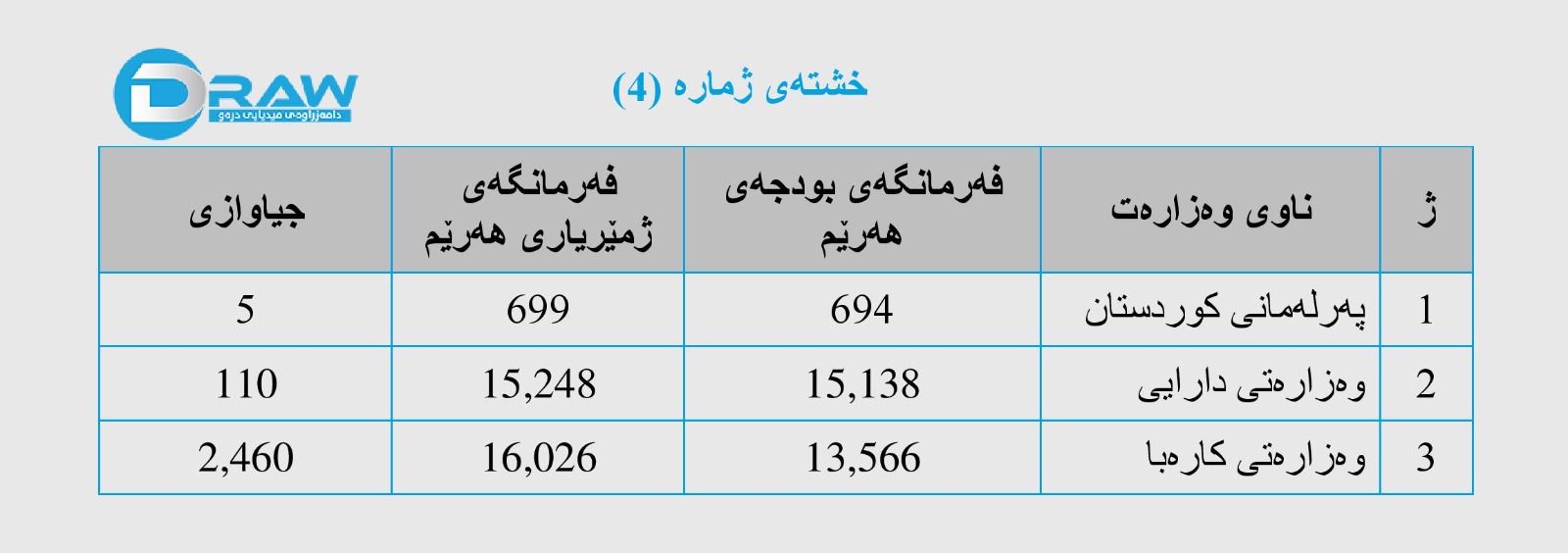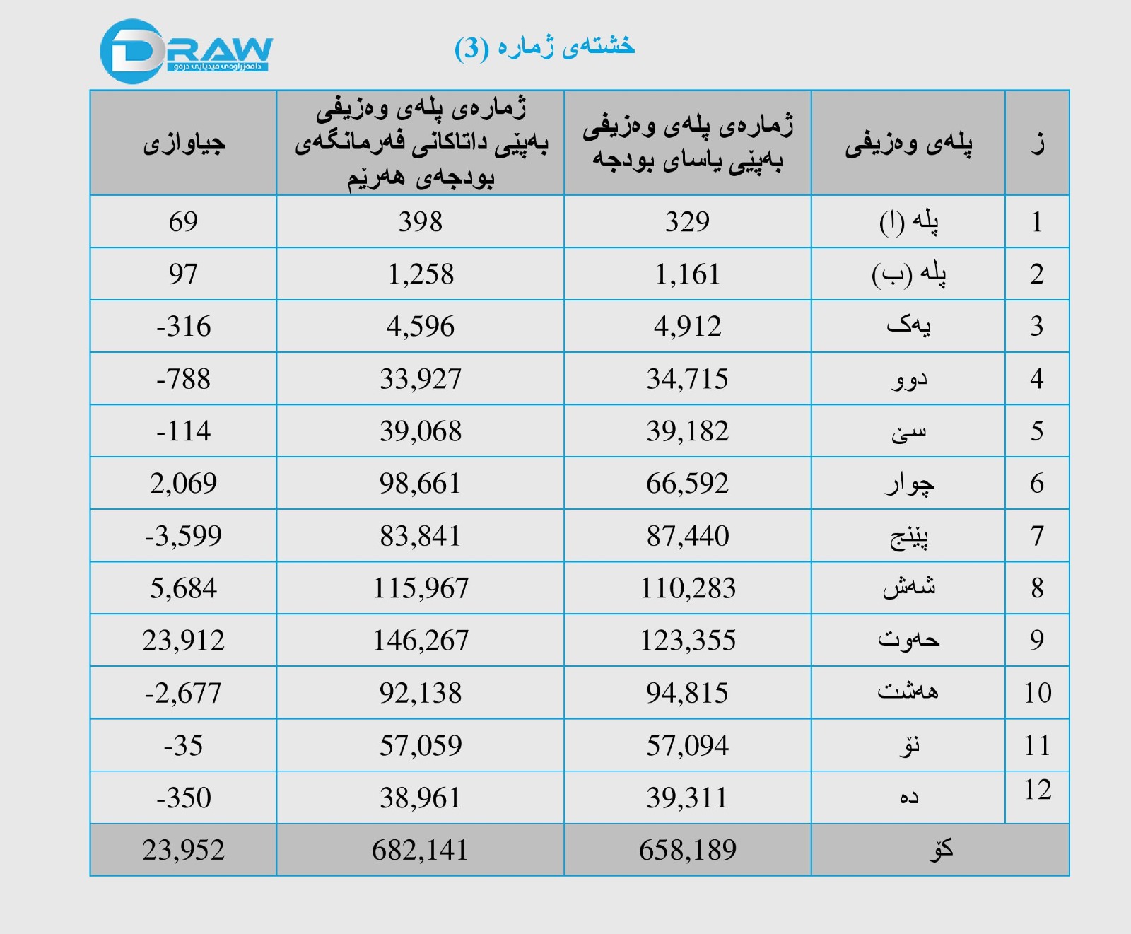 3. ناهاوتایی لە ژمارەی میلاکاتی هەرێمی کوردستان لەسەر ئاستی پلە وەزیفییەکان وەک ئەوەی فەرمانگەی بودجەی وەزارەتی دارایی و ئابوری هەرێم پێی داون لەگەڵ ئەوەی لە یاسای بودجەی عێراقداهاتووە. بڕوانە خشتەی ژمارە (3).