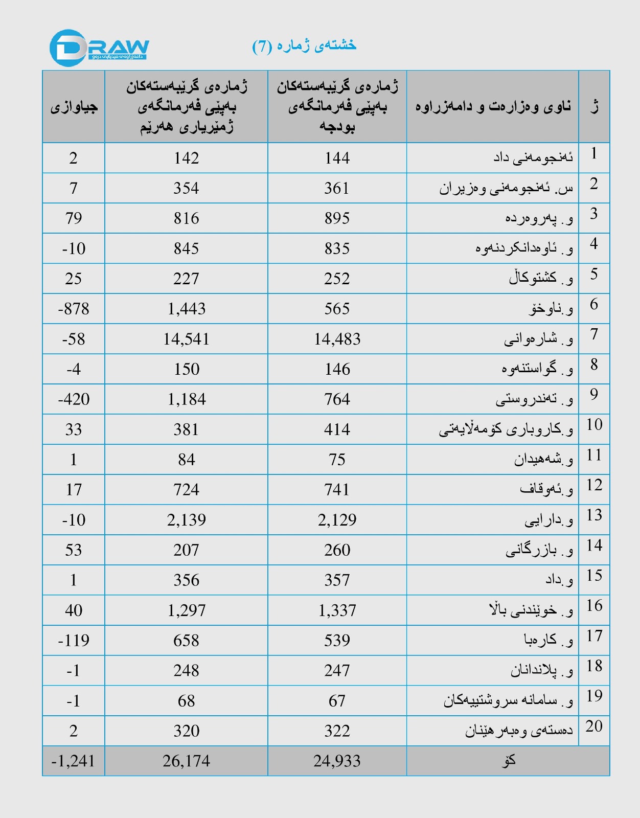 ? ناهاوتایی لە ژمارەی فەرمانبەرانی (هەمیشەیی + گریبەست) هەیە بەگوێرەی داتاکانی فەرمانگەی بودجە و فەرمانگەی ژمێریاری هەرێم لەسەر ئاستی (33) وەزارەت و دامەزراوەکانی نەبەستراو بە وەزارەتەکان.