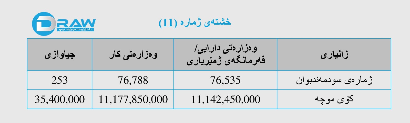 تیمی هاوبەشی هەردوو دیوانی چاودێری دارایی ئیتحادی و دیوانی چاودێری دارایی هەرێمی کوردستان بۆ جێبەجێکردنی بڕیاری ئەنجومەنی وەزیران ژمارە (23520)ی 2023، بەپێی ڕێوشوێنە یاساییەکان و هەماهەنگی نێوان هەردوو دەزگاکە، پشت بەست بە حوکمەکانی یاسای دیوانی چاودێری دارایی ئیتحادی ژمارە (31)ی ساڵی (2011)ی بەرکار و یاسای دیوانی چاودێری دارایی هەرێمی کوردستان ژمارە (2)ی ساڵی (2008) هەستاون بە وردبینی کردن لە ژمارەی فەرمانبەران و موچەخۆرانی چاودێری کۆمەڵاتی و خانەنشینانی هەرێمی کوردستان مانگی (حوزەیرانی 2023) بە پێوەر وەرگیراوە.