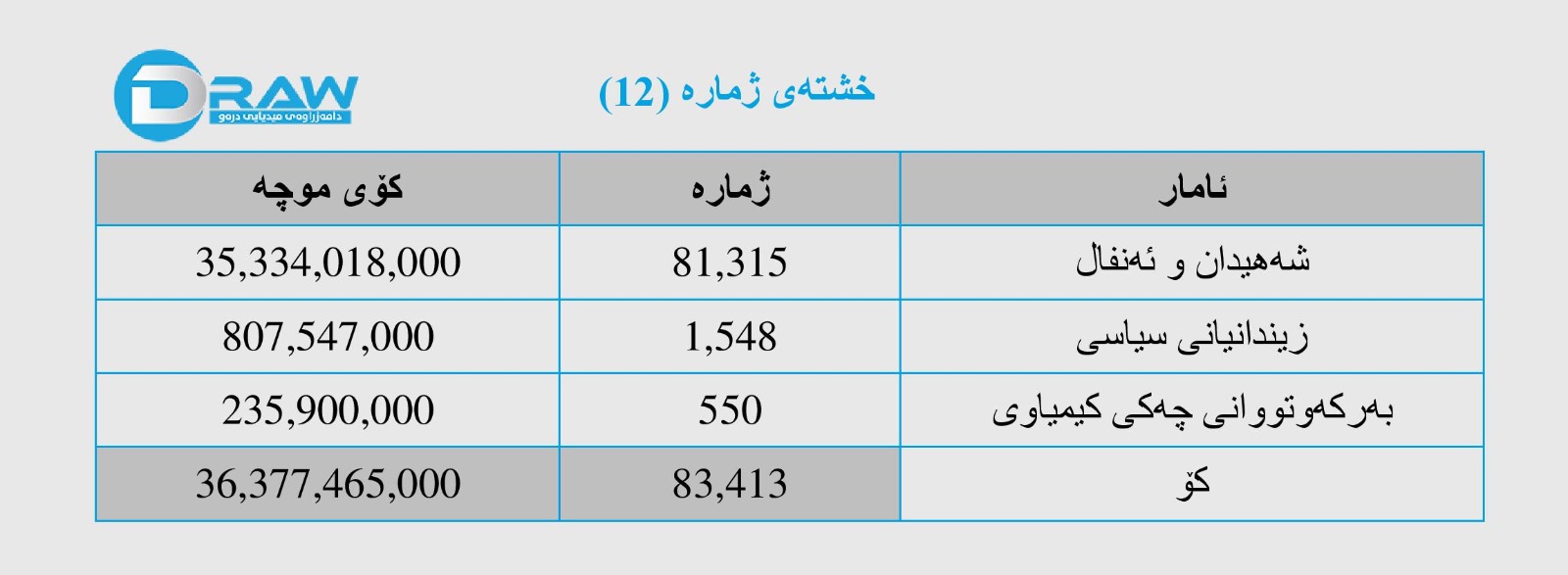 بەپێی بایۆمەتری ژمارەی شەھیدان و کەسوکاری ئەنفالکراوان و زیندانیانی سیاسی و بەرکەوتووانی کیمیاوی (96 هەزار و 779) یە، بەپێی ئەو لیستەی خراوەتەڕوو (83 هەزار و 413) کەس موچەیان هەیە و کۆی موچەکەیان (36 ملیار و 377 ملیۆن و 465 هەزار) دینارە. وەک لە خشتەکانی ژمارە (12 و 13) رونکراوەتەوە.