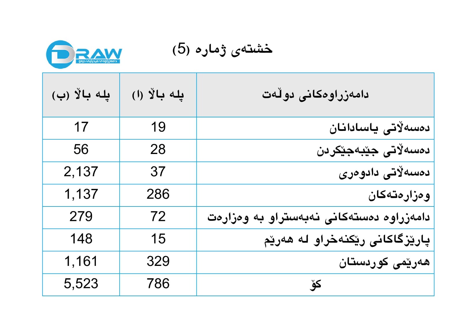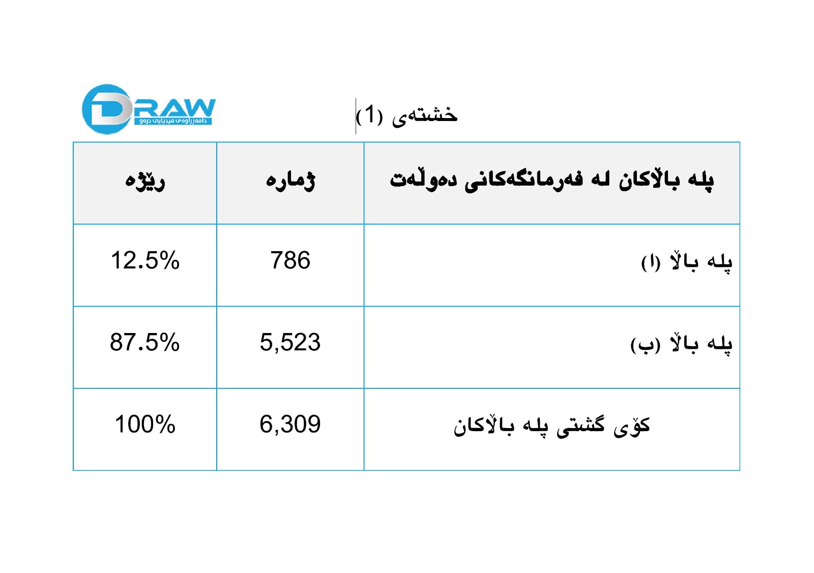 بەکورتی پلە باڵاکان لە دامەزراوەکانی دەوڵەت دابەشبوونەکەیان بەو جۆرەیە کە لە خشتەی ژمارە (5) رونکراوەتەوە.