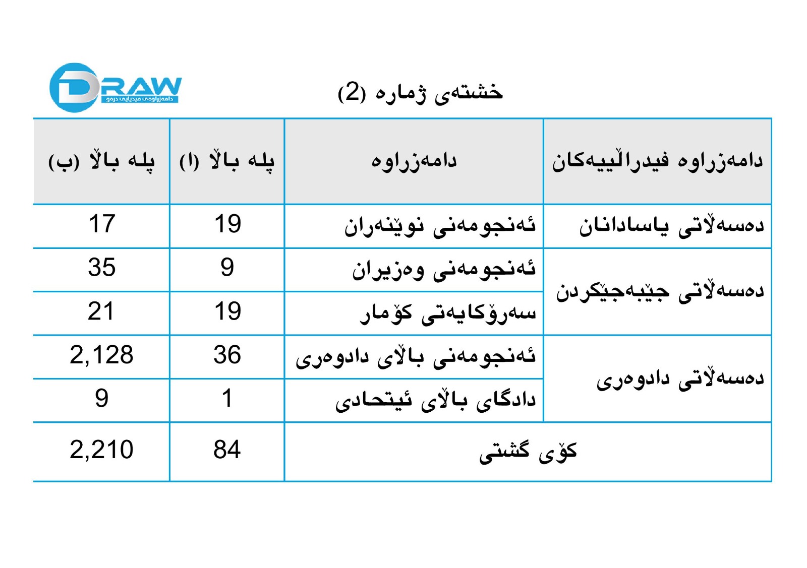 وەک لە خشتەی (2)دا رونکراوەتەوە کە دەسەڵاتی دادوەری زۆرترین ژمارەی پلە باڵا (ا)ی لەخۆ گرتووە، کە ژمارەیان گەیشتووە بە (37) کەس. لە کاتێکدا دەسەڵاتی جێبەجێکردن بە بوونی (28) پلە باڵا (ا) بە پلەی دووەم دێت، دەسەڵاتی یاسادانانیش تەنها (19) کەسی تێدایە بە پلە باڵای (ا).