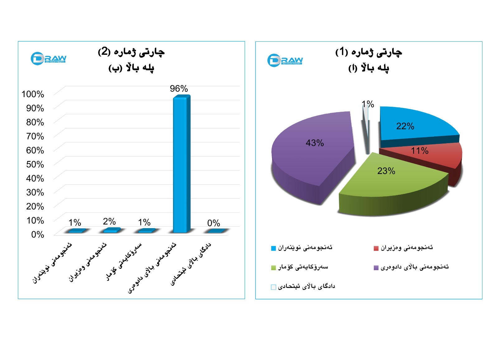 لەسەر ئاستی پلە باڵای (ب) دەسەڵاتی داوەری بێ ئەندازە پلە باڵای تێدایەو ژمارەیان گەیشتووە بە (2 هەزار و 137) کەس، ئەمەش جیاوازییەکەی گەورەی دەسەڵاتی دادوەری نیشان دەدات بەراورد بە دەسەڵاتەکانی دیکە لە ڕووی بوونی پلە پاڵاکان. چارتی ژمارە (1 و 2) شێواز و ڕێژەی دابەشبونی پلە باڵاکانی (ا و ب) ڕوندەکاتەوە.