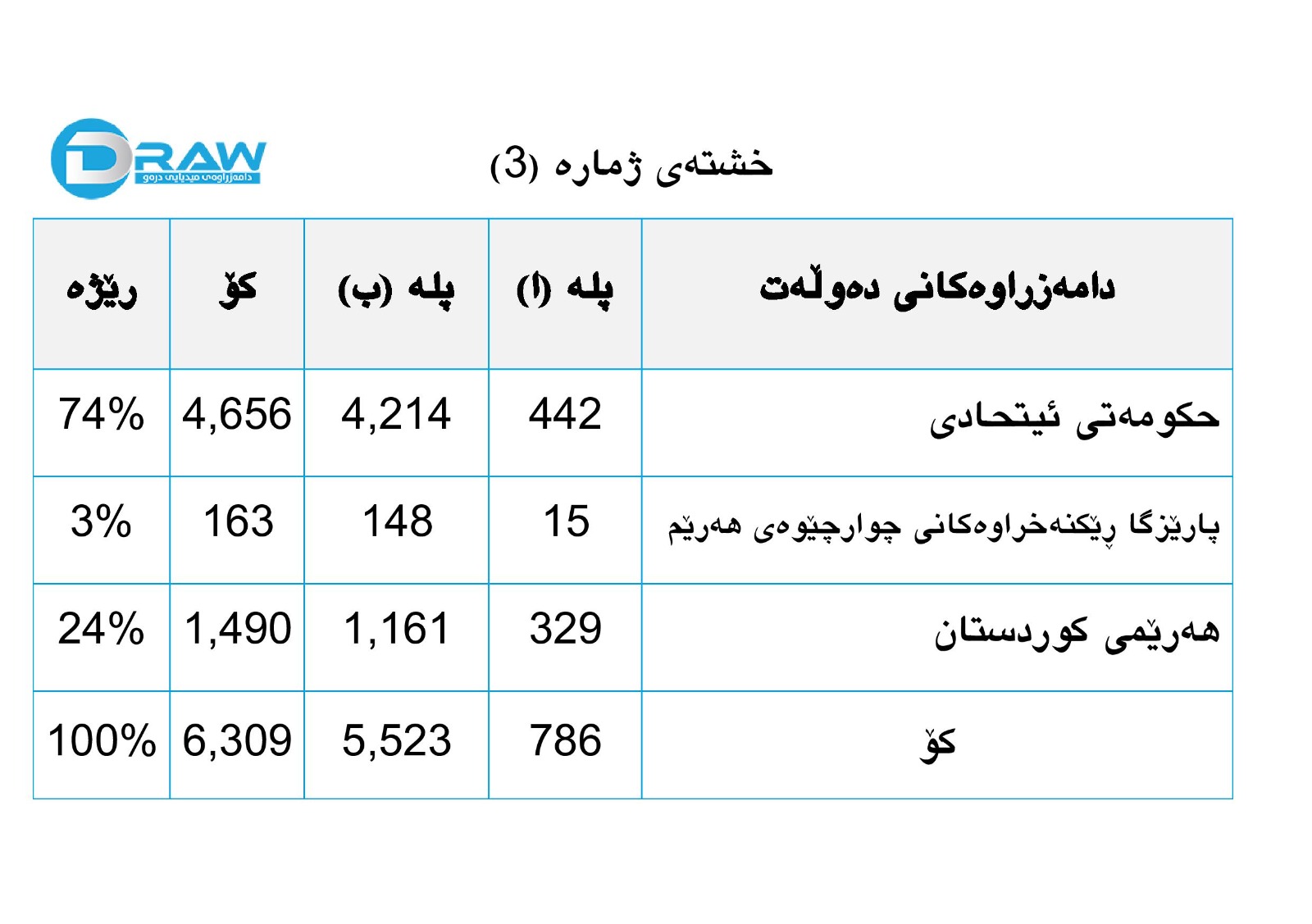 لە کاتێکدا پلە باڵاکان لەسەر ئاستی ناوەند (حکومەتی ئیتحادی)، هەرێمی کوردستان و پارێزگا ڕێکنەخراوەکانی چوارچێوەی هەرێمێک، بەم شێوەیە دابەشبوون، (74%)ی لە نێو دەزگا فەرمییەکانی حکومەتی ئیتحادی و (3%)یان لە پارێزگا ڕێکنەخراوەکانی چوارچێوەی هەرێم و (24%) لە فەرمانگە و دامەزراوەکانی هەرێمی کوردستان خزمەت دەکەن. وەک لە خشتەی ژمارە (3)دا هاتووە.