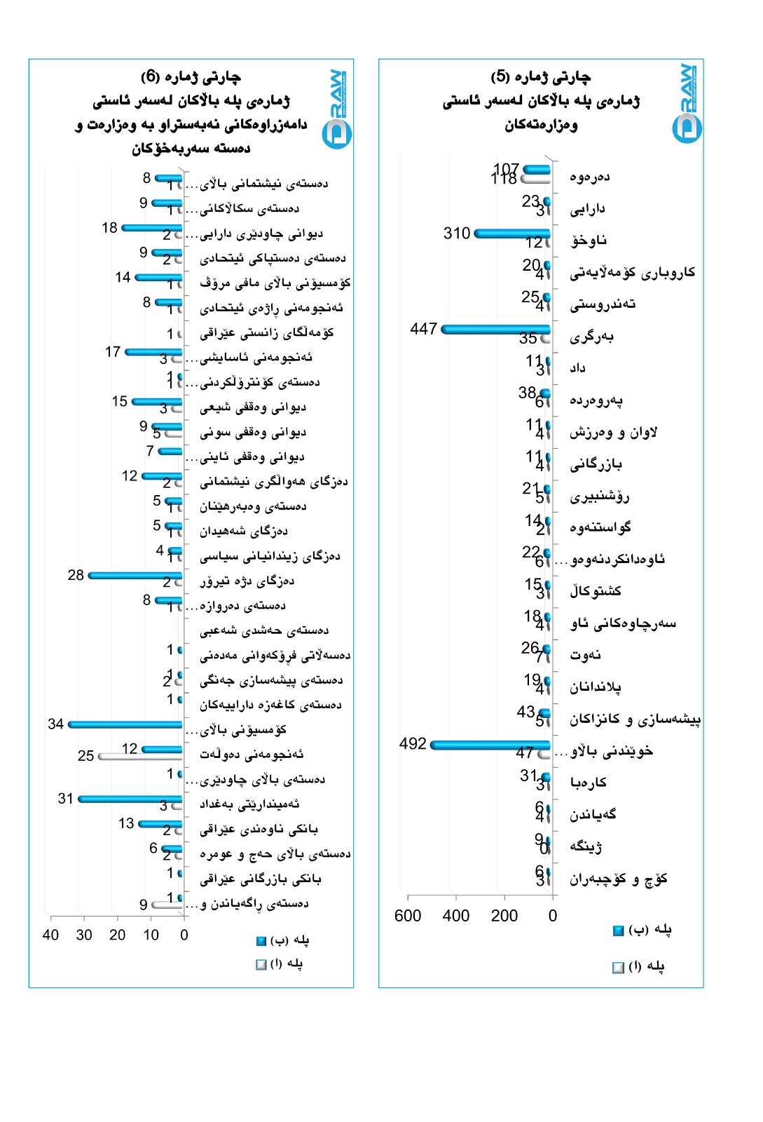 لەکاتی بەراوردکردنی ژمارەی پلە باڵاکان لە وەزارەت و دامەزراوەکانی نەبەستراو بە وەزارەت و دەستە سەربەخۆکان، ئەوە دەردەکەوێت کە ناهاوسەنگی گەورە هەیە لە نێوانیان لە رووی دابەشبوونی پلە باڵاکان (ا و ب)، بە جۆرێک ژمارەی پلە باڵاکان لە نێو وەزارەتەکان (7) جار زیاترە لەوەی لە نێو دامەزراوە نەبەستراوەکانی نەبەستراو بە وەزارەت و دەستە سەربەخۆکان، وەک ئەوەی لە خشتەی ژمارە (4) و چارتەکانی (5 و 6) رونکراوەتەوە.