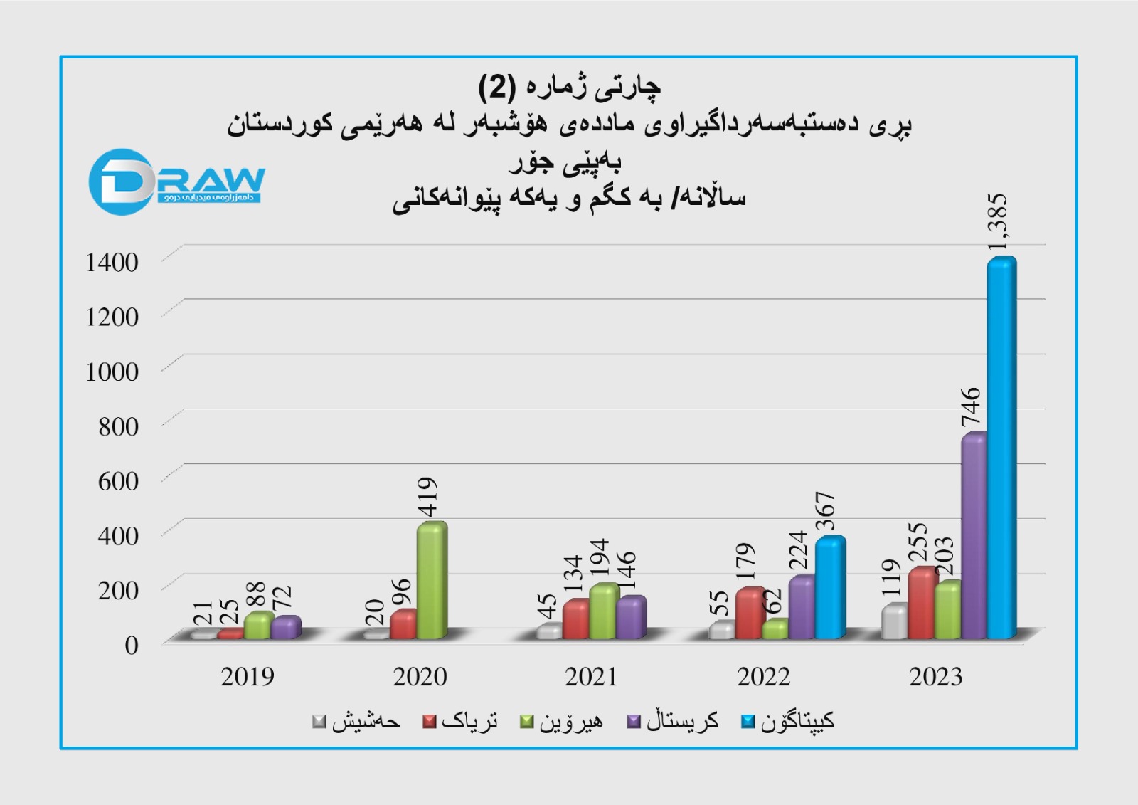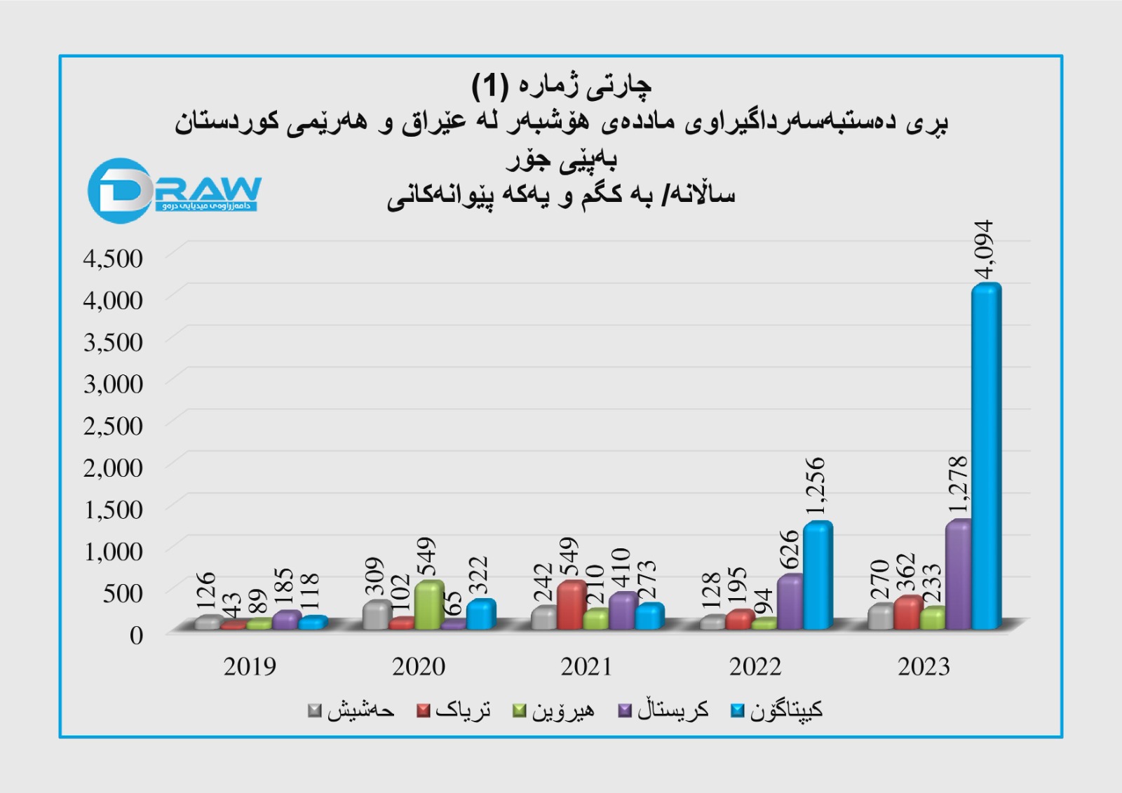 ? بەپێی ئاماری دەزگا ئەمنییەکانی (هەولێر، سلێمانی و دهۆک) کە پێشکەش بە ڕێکخراوی نەتەوە یەکگرتووەکان تایبەت ماددە هۆشبەرەکانیان کردووە، لە ماوەی ساڵانی (2019 – 2023)، بەردەوام قەبارەی دەستبەسەرداگرتنی ماددە هۆشبەرەکان ڕووی لە هەڵکشانە، بەجۆرێک؛ کۆی ماددەکانی (حەشیش، تریاک، هیرۆین، کریستاڵ، کیپتاگۆن)ی دەستبەسەرداگیراو لە ساڵی (2019) تەنها (206) کگم بووە، بەڵام لە ساڵی (2023) گەیشتووە بە (2 تەن و 708 کگم).
