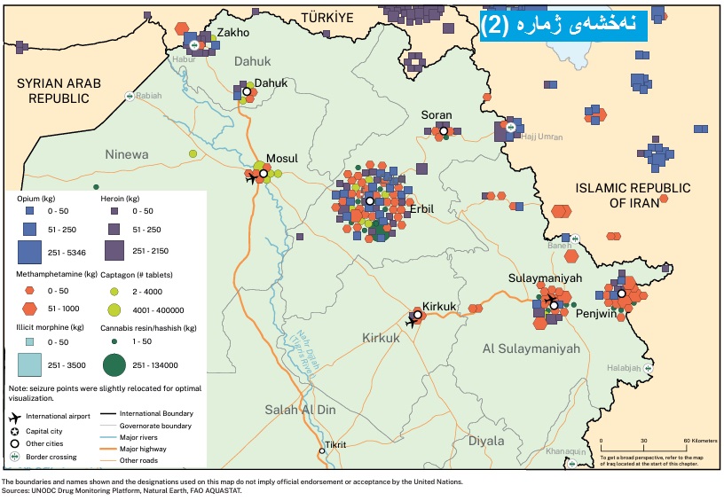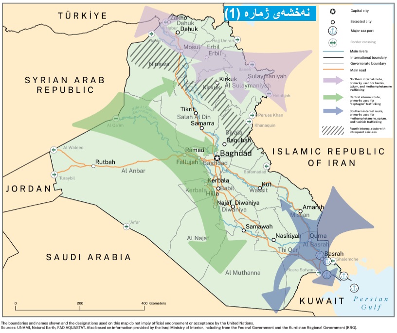 ڕاپۆرتەکەی ڕێکخراوی نەتەوە یەکگرتووەکان تایبەت بە ماددە هۆشبەرەکان (UNDOC) ئاماژە بە سێ ڕێڕەوی بازرگانی ماددەی هۆشبەر دەکات لە عێراق و ڕێڕەوەکانیش ڕەهەندێکی مێژوویی جیوسیاسییان هەیە، کە بریتن لە ڕێڕەوەکانی (باکوری عێراق، ناوەڕاست و باشور) سنورەکانی عێراق بە ئێران و تورکیا و سوریا و سعودییە دەبەستنەوە، لێرەدا تیشک دەخەینە سەر ئەو ڕێڕەوەی دەکەوێتەوە هەرێمی کوردستانەوە. وەک لە (نەخشەی ژمارە (1))دا هاتووە.