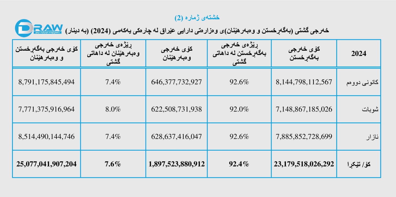 لە سێ مانگی یەکەمی ساڵی (2024)، کۆی گشتی خەرجییەکانی عێراق بە هەردوو خەرجی (بەگەڕخستن و وەبەرهێنان)ەوە، بریتی بووە لە (25 ترلیۆن و 77 ملیار و 41 ملیۆن و 907 هەزار و 204) دینار.