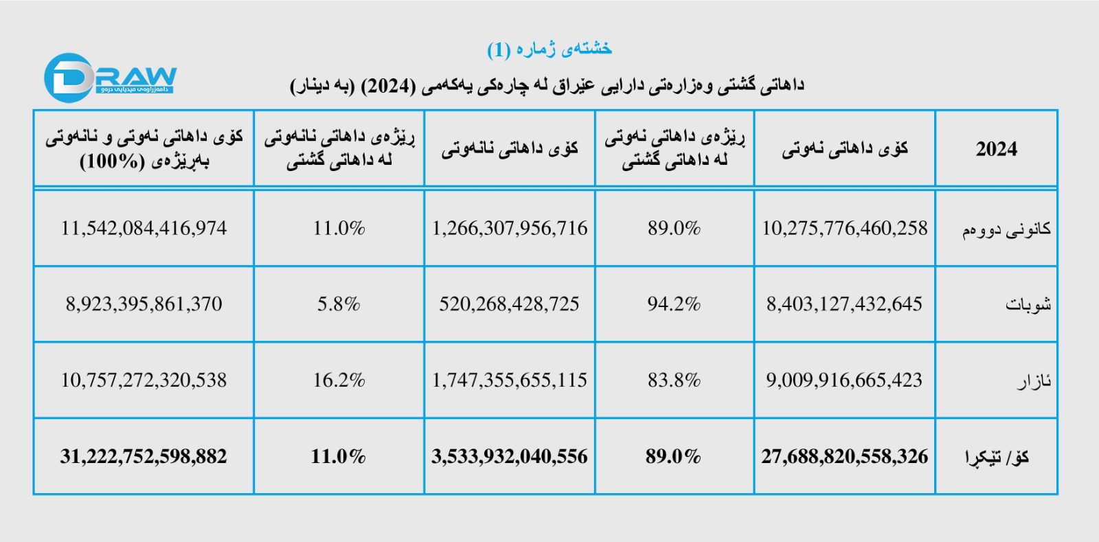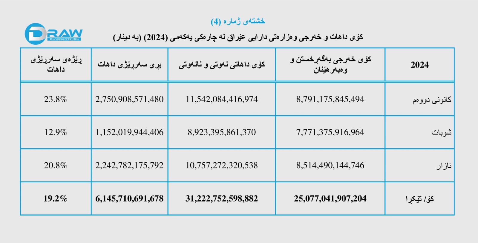 رۆژی (15ی ئایاری 2024) وەزارەتی دارایی عێراق داهات و خەرجی خۆی بۆ چارەکی یەکەمی ئەمساڵ بڵاوکردەوە، بەپێی ڕاپۆرتەکە؛