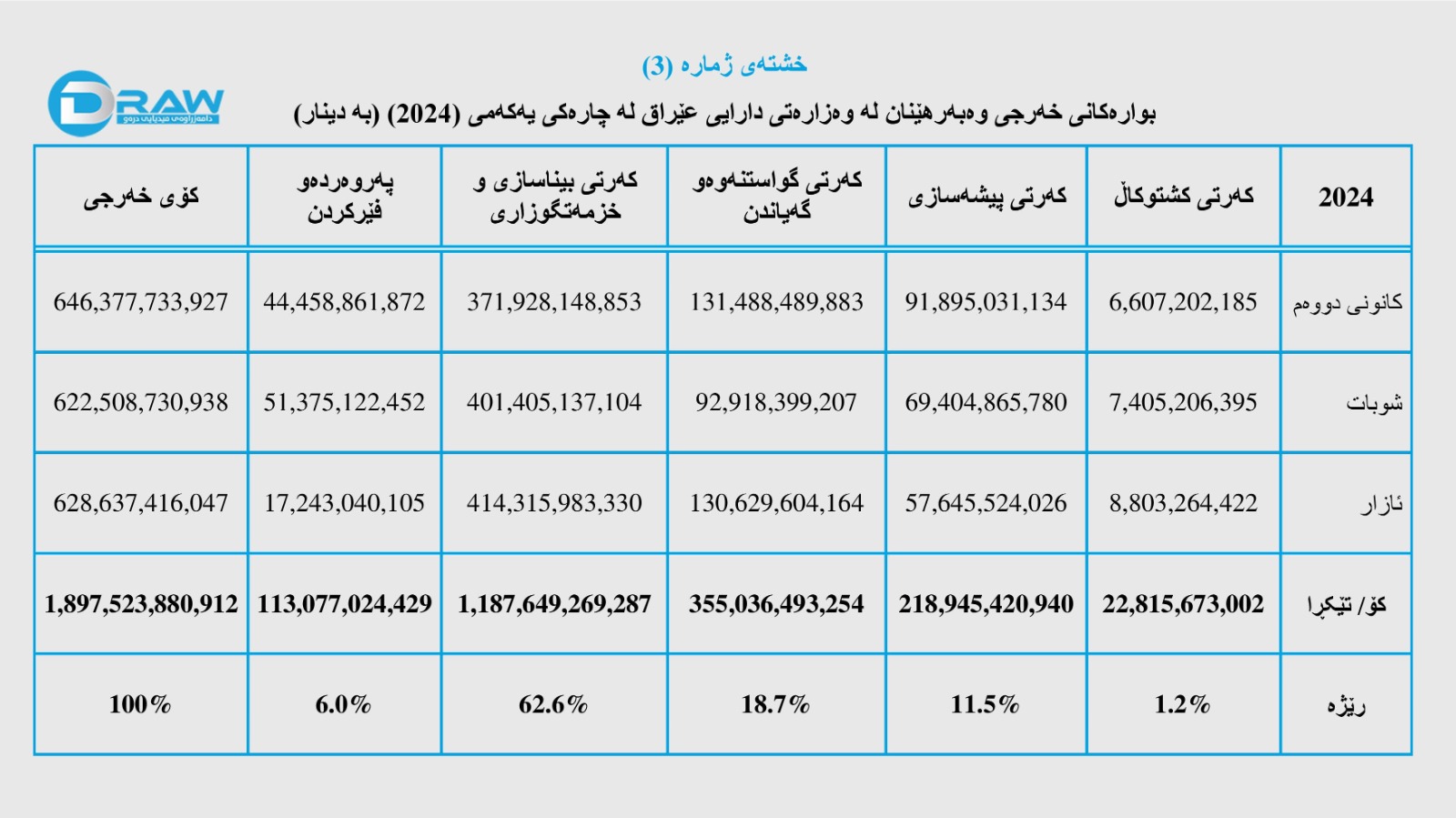 4. کەرتی بیناسازی و خزمەتگوای و ڕێگاوبان بڕی (ترلیۆنێک و 187 ملیار و 649 ملیۆن و 269 هەزار و 287) دیناری بە ڕێژەی (62.6%) بۆ خەرج کراوە.