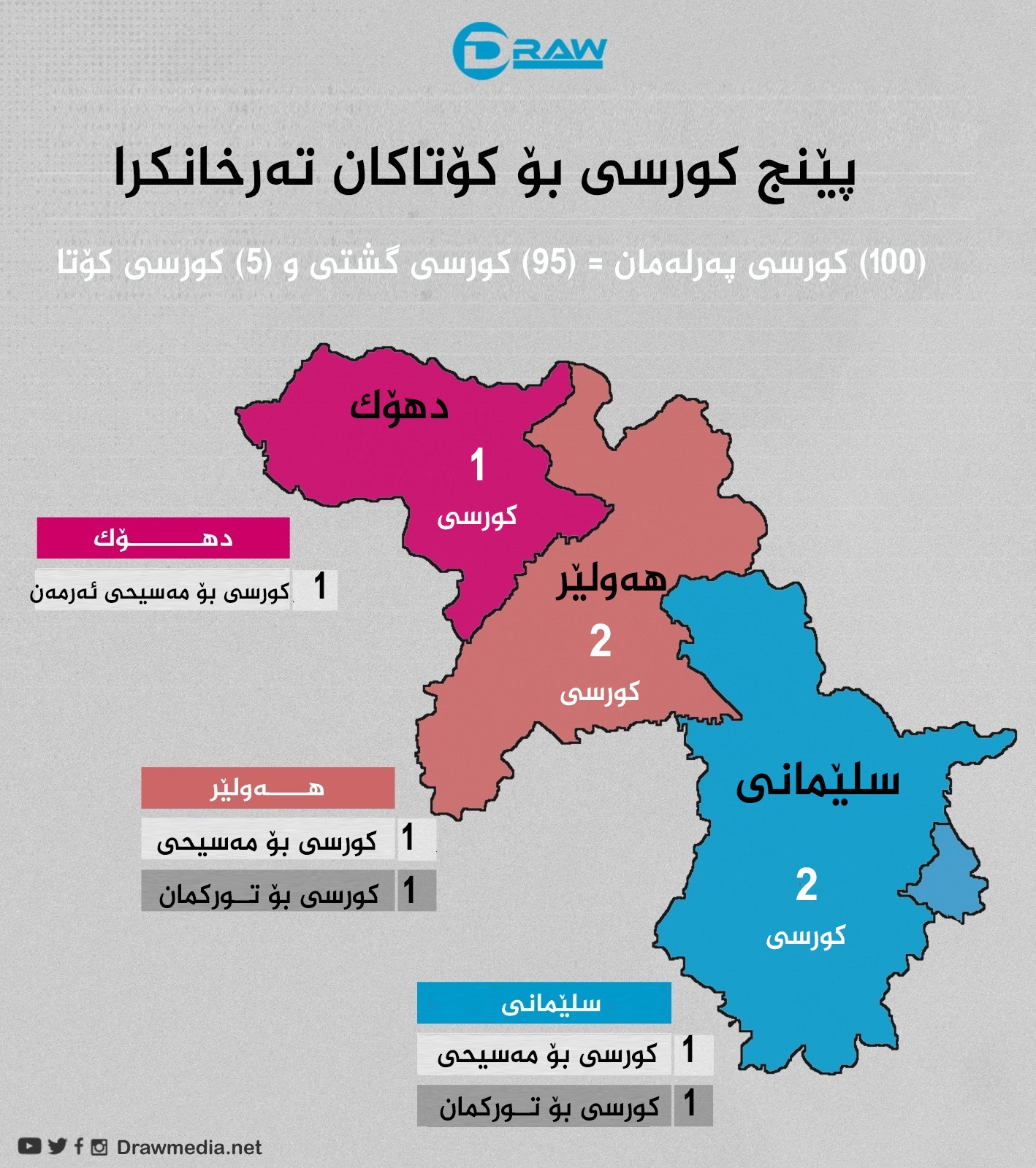 • پارێزگای سلێمانی: یهك كورسی "كۆتا" بۆ توركمان و یهك كورسی بۆ مهسیحی