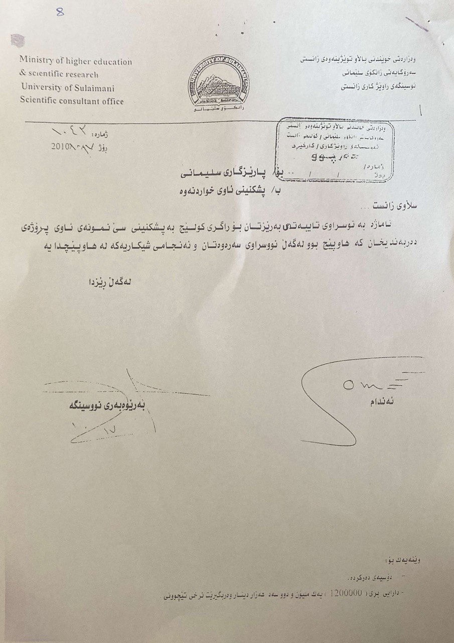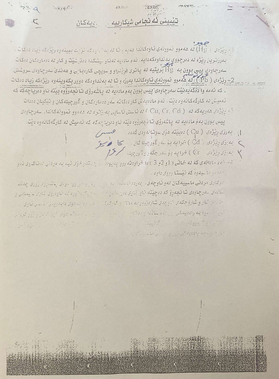 ئەو فەرمانبەرە ئاماژە بەوە دەکات، نوسینگەی ڕاوێژکاری زانستی لە زانکۆی سلێمانی بۆچوونێکی جیاوازی هەبووە لە ئەنجامی شیکارییەکانی بەڕێوبەرایەتی ئاو لەو ماوەیەدا، بەو پێیەی ئەنجامی شیکارییەکی بۆ پارێزگای سلێمانی ناردووە کە لەلایەن کارمەندانی نوسینگەی ڕاوێژکارییەوە لەسەر ئەو ئاوە ئەنجامدراوە، دەریدەخات کە "مس، کرۆم و کادمیۆم"ی تێدایە، کە لە پاشماوەی کارگە پیشەسازییەکانەوە سەرچاوەی گرتووە.