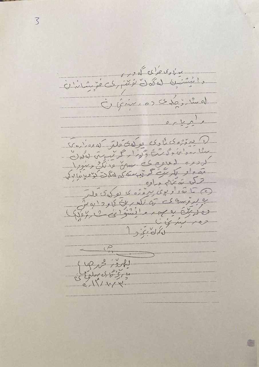 دەستکی دەبەکە دەگرێت و هێواش هێواش دەیباتە سەر سندوقی ئۆتۆمبێلەکەی لە نیوەی ڕێگاکەدا دەوستێت و بە وریاییەوە دەیخاتە سەر زەوی، و دوای بەرزکردنەوەی قۆڵەکانی دەڵێت: "لە ساڵی ٢٠٠٨ەوە بەشداری زۆرێک لە خۆپیشاندان و ناڕەزایەتییەکانم کردووە لە شاری دەربەندیخان، بۆ ناڕەزایەتی دەربڕین بەرامبەر پیسبوونی ئاو، بۆ دۆزینەوەی چارەسەرێک بۆ کێشە درێژخایەنەکەمان".
