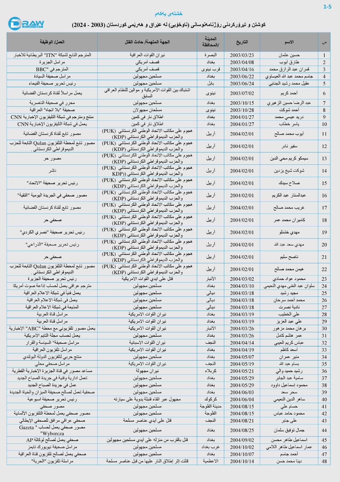 لەدوای ساڵی (2003)ەوە (268) رۆژنامەنوسی عێراقی لەکات و شوێنی جیاواز کوژارو تیرۆرکراون، لە خشتەی یەکەمدا زانیاری ورد لە بارەی کات و شوێن و تۆمەتباران و جۆر و شوێنی کاری رۆژنامەنوسە تیرۆرکراوەکان ئاماژەی پێدراوە.