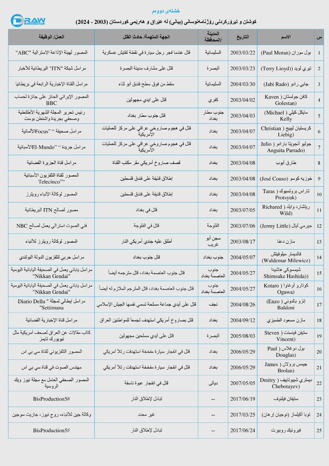 لە دوو دەیەی ڕابردوودا (25) رۆژنامەنوسی بیانی لە عێراق و لە کات و شوێنی جیاواز کوژارو تیرۆرکراون، لە خشتەی دووەمدا زانیاری ورد لە بارەی کات و شوێن و تۆمەتباران و جۆر و شوێنی کاری رۆژنامەنوسە تیرۆرکراوەکان ئاماژەی پێدراوە.