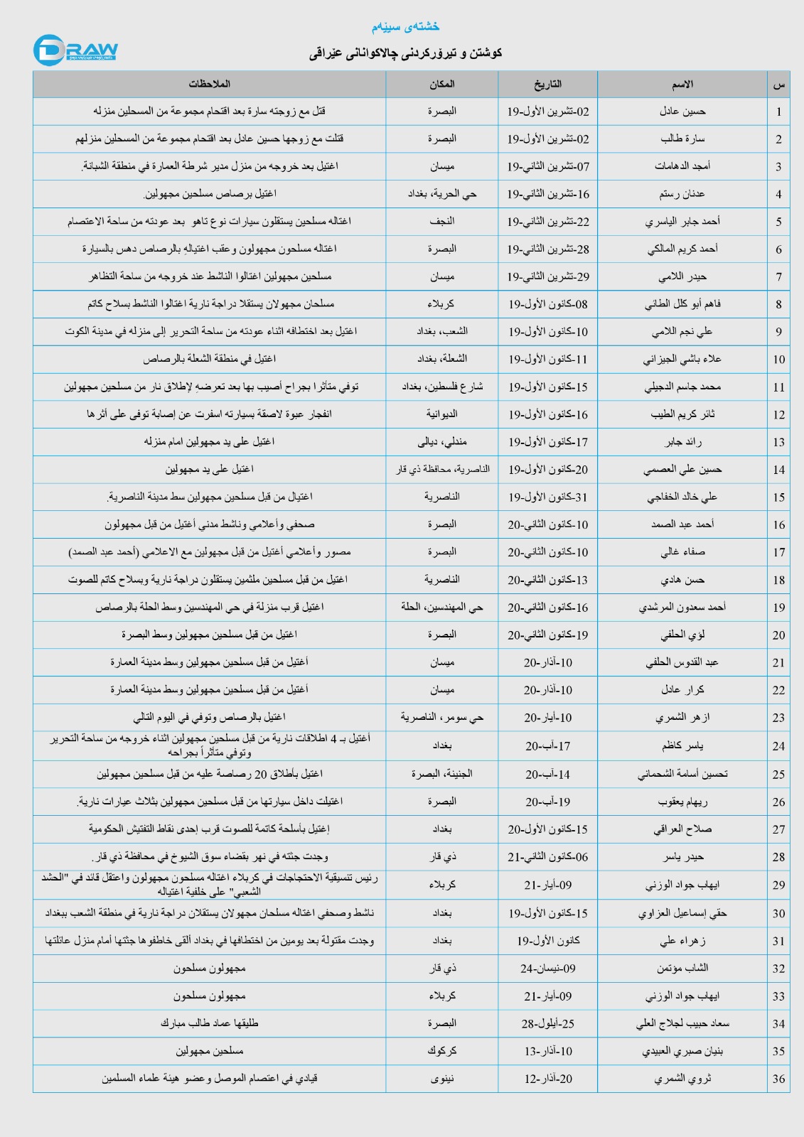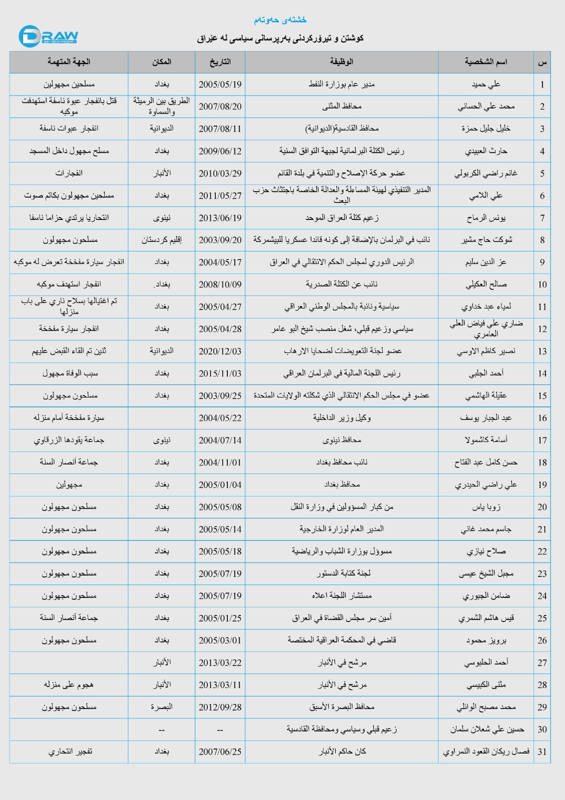 (31) حاڵەتی کوشتن و تیرۆرکردنی بەرپرسی دیاری سیاسی لە عێراق تۆمار کراوە، لە خشتەی حەوتەمدا زانیاری ورد لە بارەی کات و شوێن و تۆمەتباران و تیرۆرکراوەکان هاتووە.