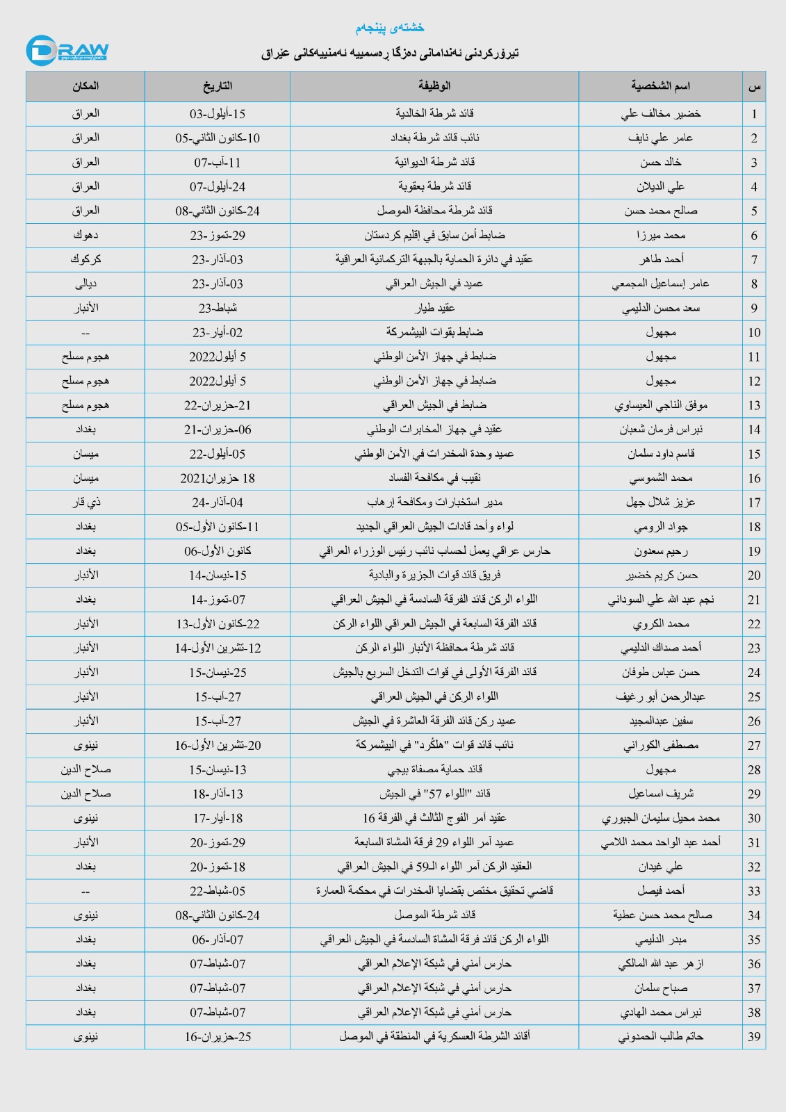 لەدوای ساڵی (2003)ەوە (39) حاڵەتی کوشتن و تیرۆرکردنی ئەفسەر و کارمەندی پلە باڵای دەزگا ئەمنی هەواڵگرییەکان لە عێراق تۆمار کراوە، لە خشتەی پێنجەمدا زانیاری ورد لە بارەی کات و شوێن و تۆمەتباران و تیرۆرکراوەکان ئاماژەی پێدراوە.