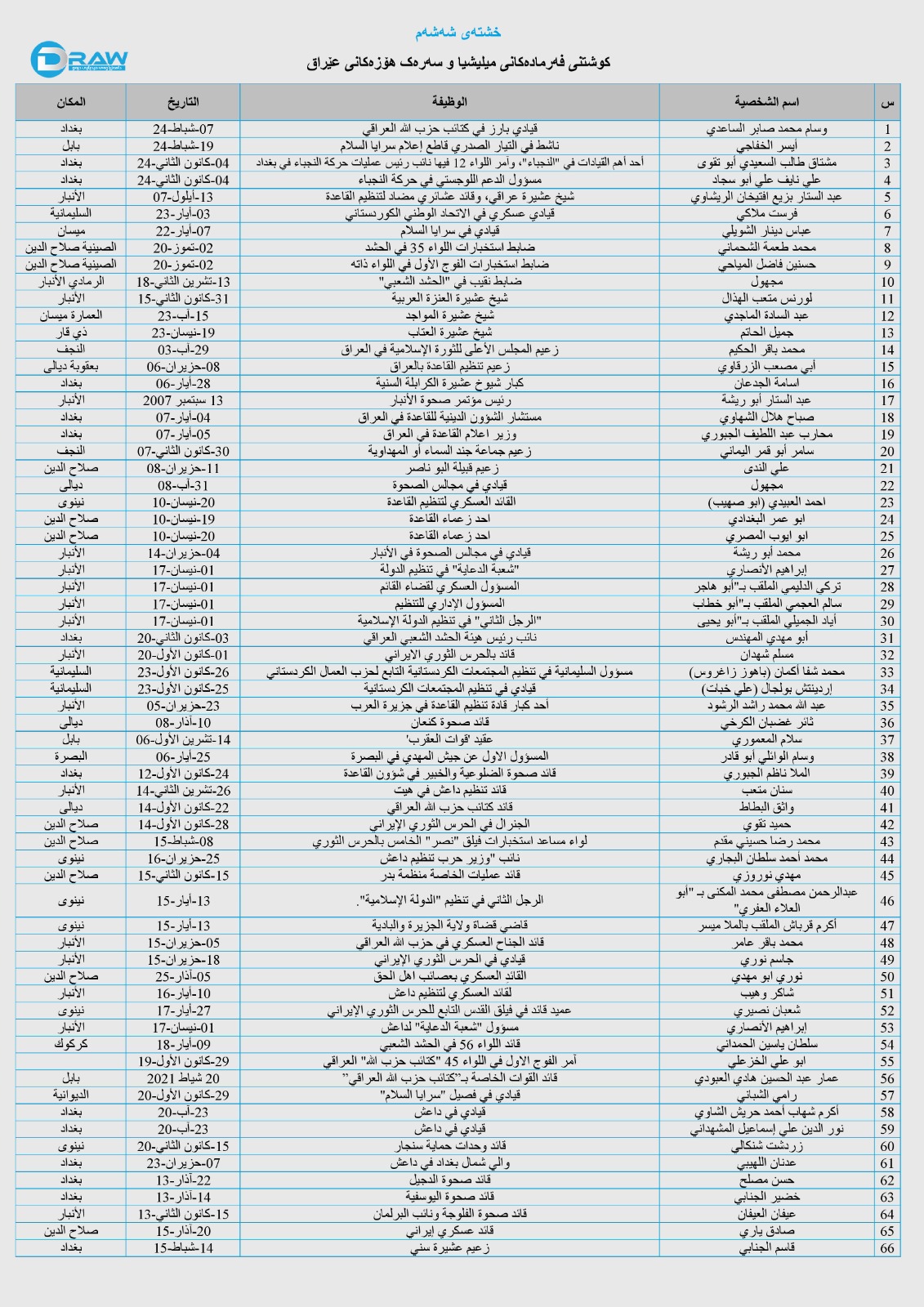 (66) حاڵەتی کوشتن و تیرۆرکردنی فەرماندەی ملیشیا چەکدارەکان و سەرۆک هۆز و عەشیرەت تۆمار کراوە، لە خشتەی شەشەمدا زانیاری ورد لە بارەی کات و شوێن و تۆمەتباران و تیرۆرکراوەکان ئاماژەی پێدراوە.