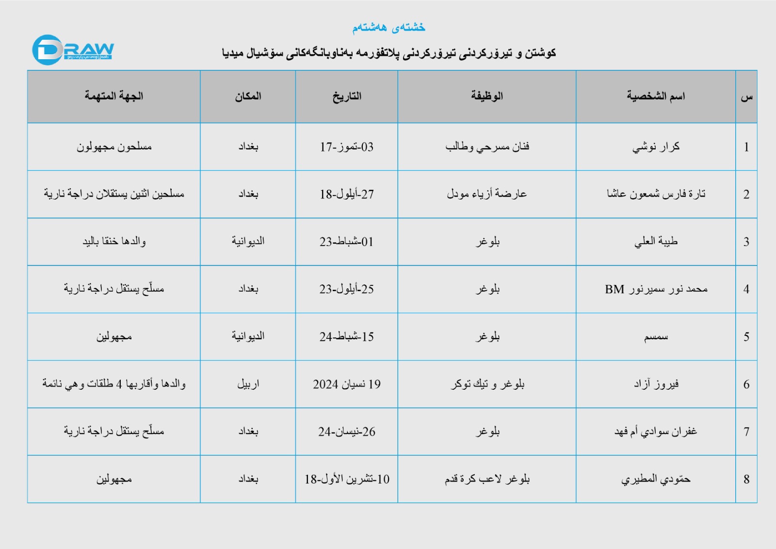 (31) حاڵەتی کوشتن و تیرۆرکردنی چالاکوانی دیاری بواری تۆڕە کۆمەڵایەتییەکان لە دوای ساڵی (2017)ەوە لە عێراق تۆمار کراوە، لە خشتەی هەشتەمدا زانیاری ورد لە بارەی کات و شوێن و تۆمەتباران و تیرۆرکراوەکان ئاماژەی پێدراوە.